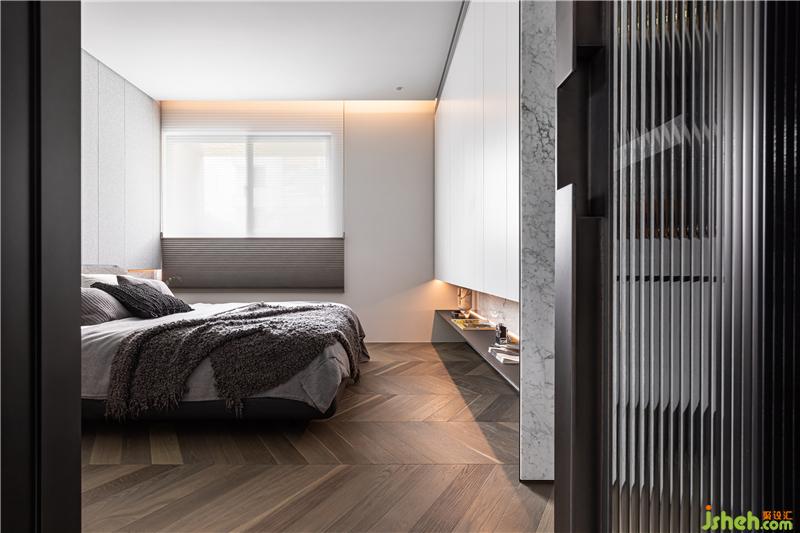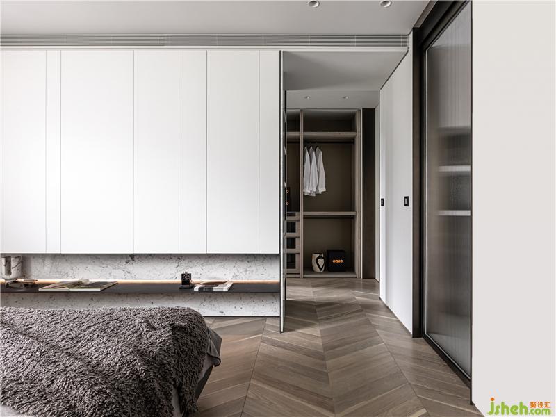 主臥入門為開放式衣帽間,一眼望穿的是二樓獨有的綠色樹梢窗景。床頭主墻簡潔的繃布分割與石材背墻,反映簡單舒適的生活調性。