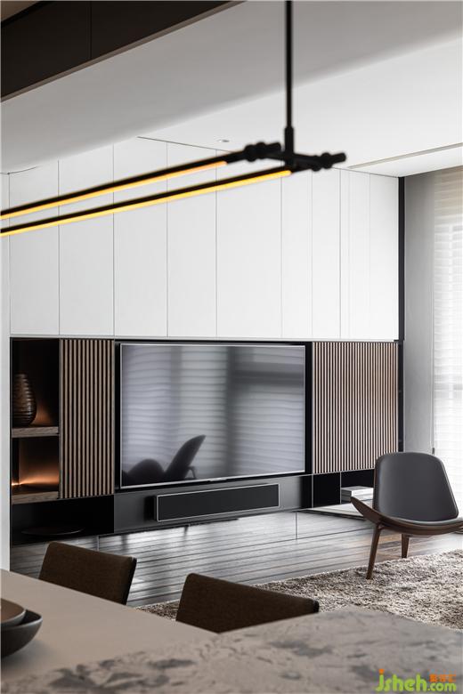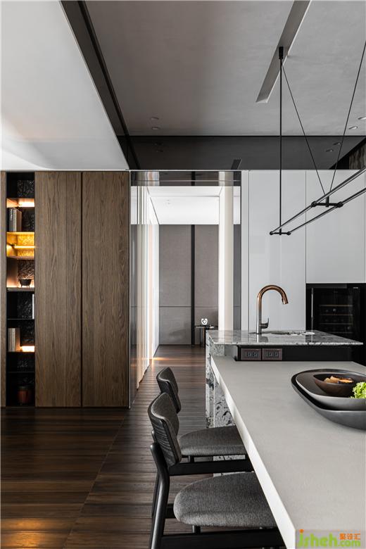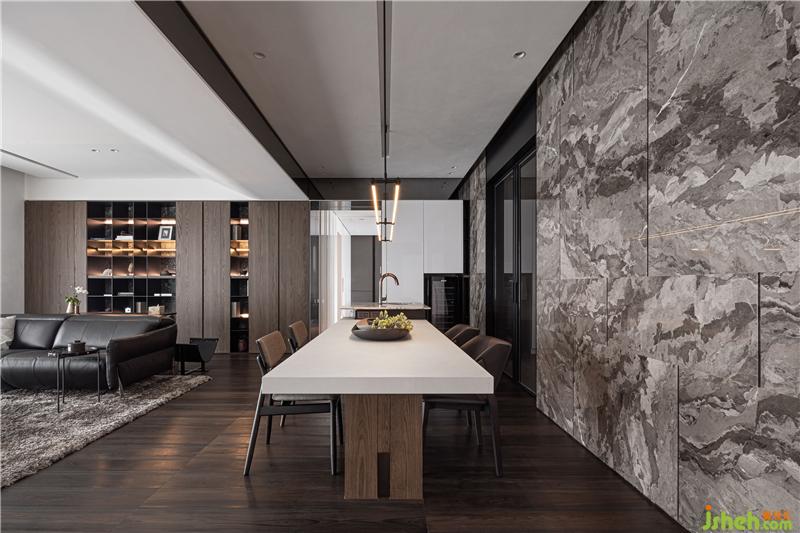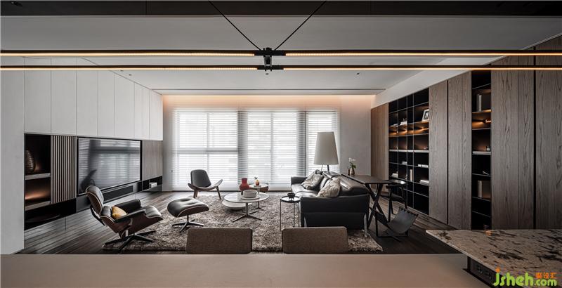 客廳書桌后靠有開放式書柜減輕了深色在視覺上的重量用點綴的方式使用暖色光源為整體空間增加感性的一面從書柜至大理石板和餐桌燈管的造型設計傳達出連貫的語匯