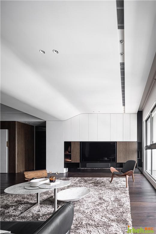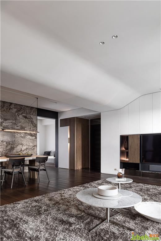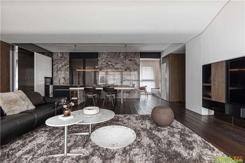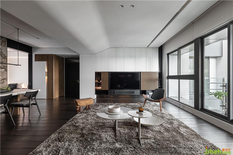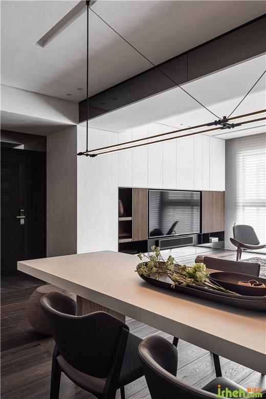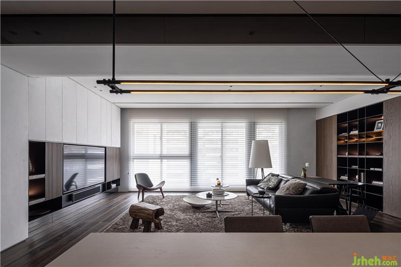 唐忠漢設計使用沉穩(wěn)的深色木地板搭配簡潔墻面延伸至天花平面配置上使用拉門定義公領域與私領域的界線