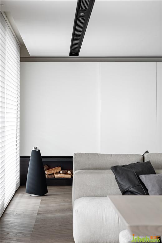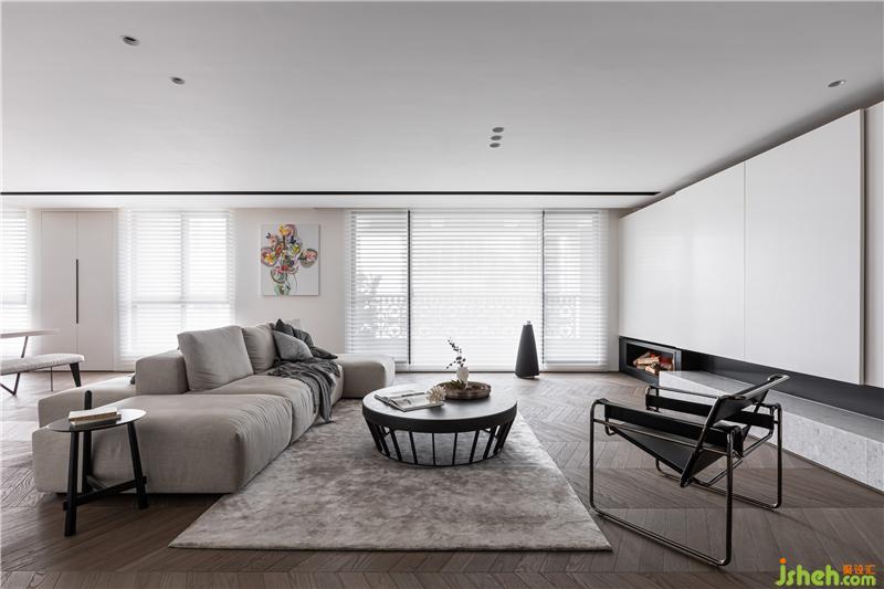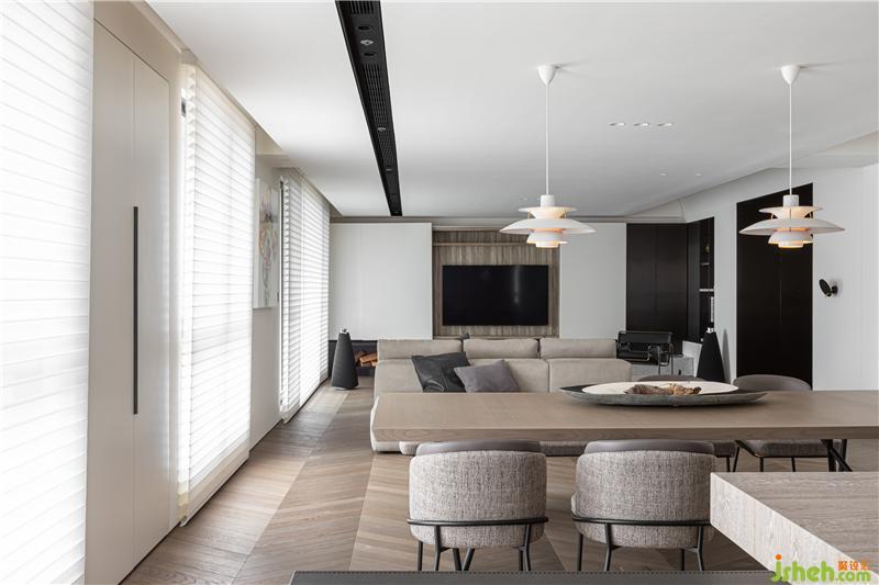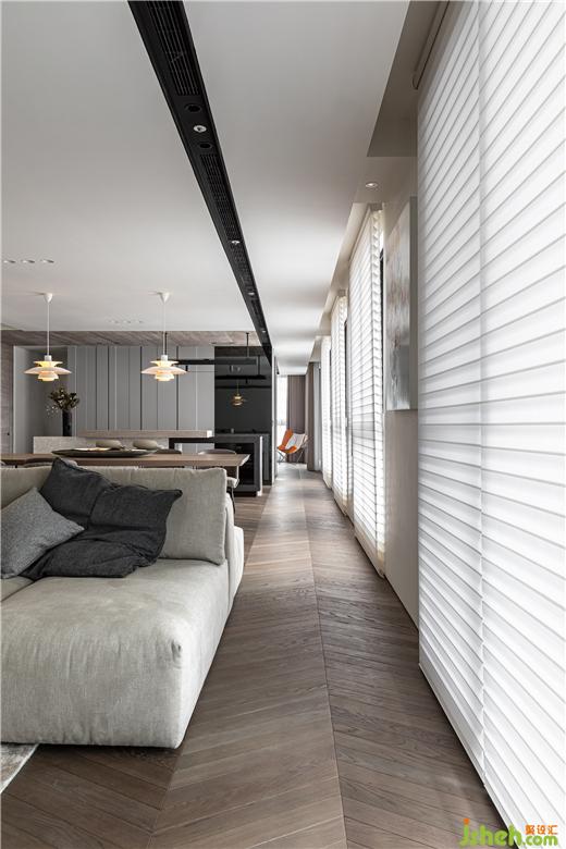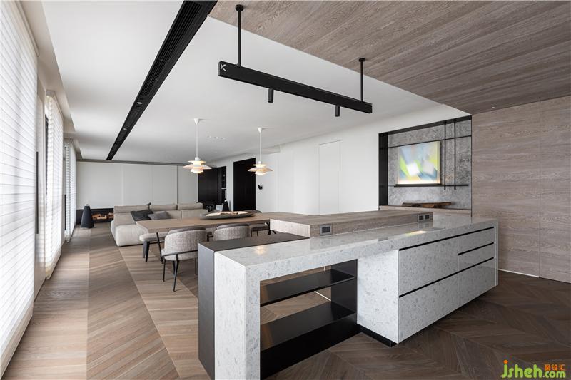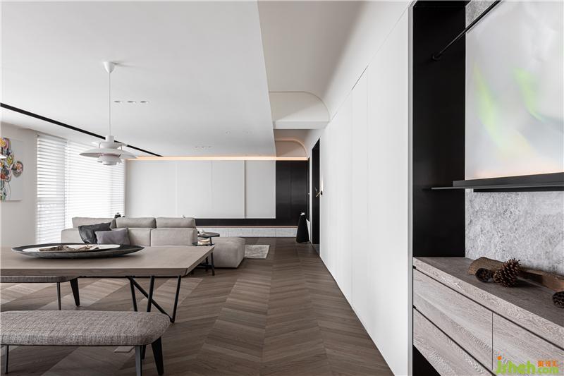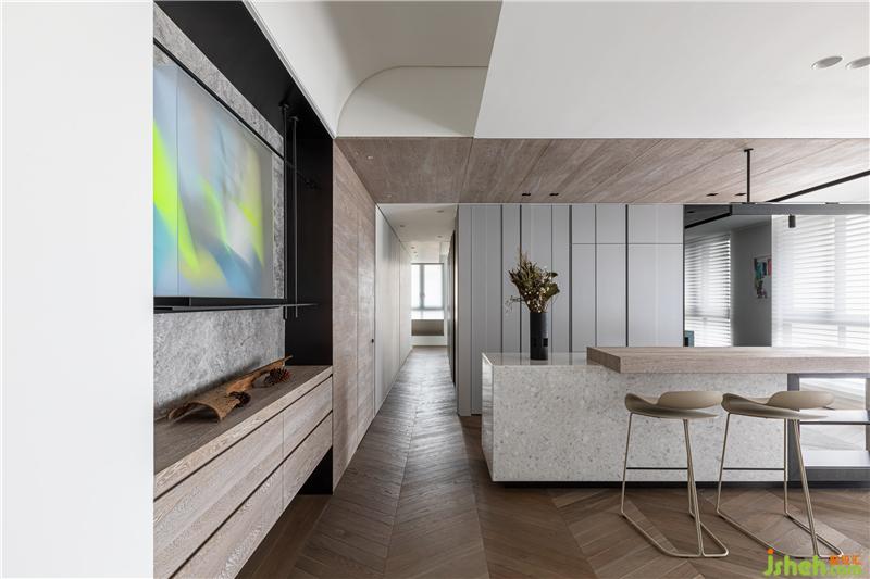 進(jìn)門玄關(guān)采用極簡(jiǎn)的手法闡釋空間,以材料劃分區(qū)域空間,不銹鋼材質(zhì)創(chuàng)造重點(diǎn)空間轉(zhuǎn)換的心理感受,灰系石材從地面延伸至墻面,形成一個(gè)L形的空間體態(tài),石材與金屬冷冽凸顯現(xiàn)代感,不同材質(zhì)圍合界定入口區(qū)域空間。穿過(guò)玄關(guān)進(jìn)入整體開放的區(qū)域,豪宅設(shè)計(jì)在大面積的墻面上用不同材質(zhì)提升變化,以廊道軸線架構(gòu)貫穿量體之間,核心連結(jié)公區(qū)與私區(qū)功能區(qū)域,客廳至中島通透性延伸了空間視覺上的深度與廣度,除了作為居住的核心主軸,也呼應(yīng)墻面造型,賦予展延空間的可能性??臻g的格調(diào)以wabi-sabi紋理為主調(diào)性,在簡(jiǎn)潔軸線墻體中揉進(jìn)弧線,再運(yùn)用線性燈具的點(diǎn)綴,加深整個(gè)細(xì)節(jié)的層次。
