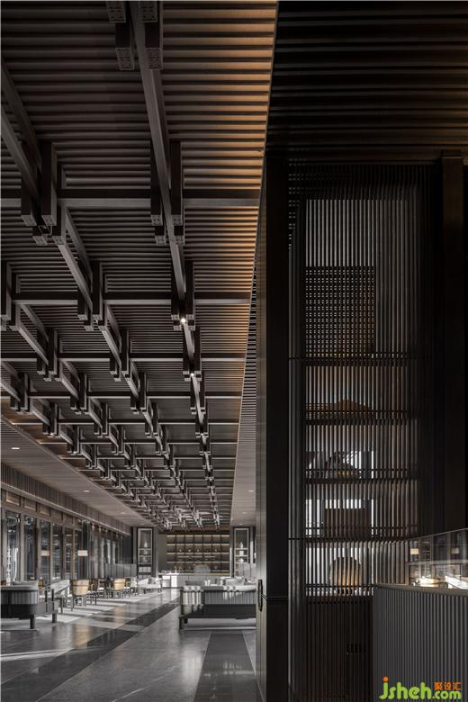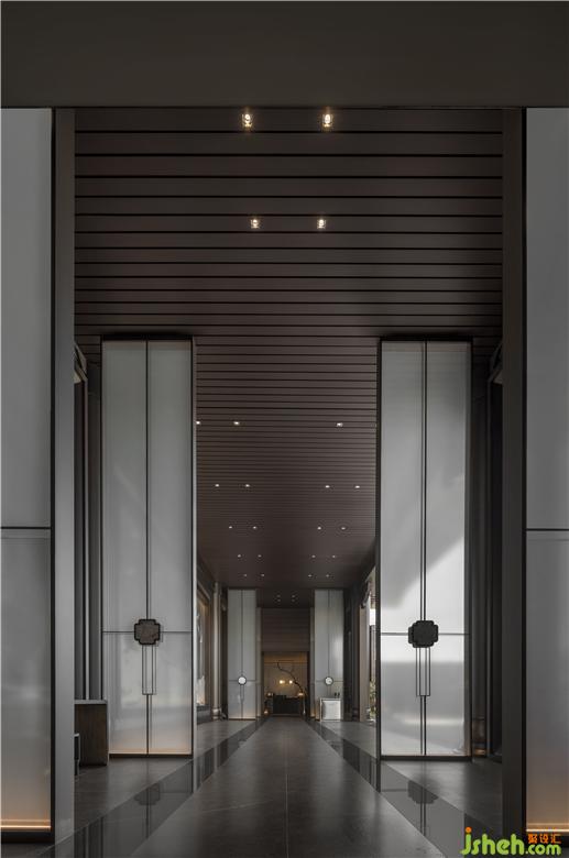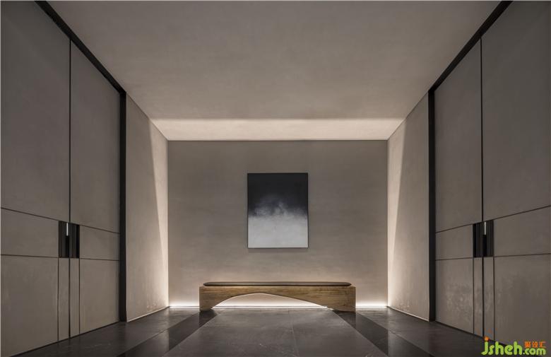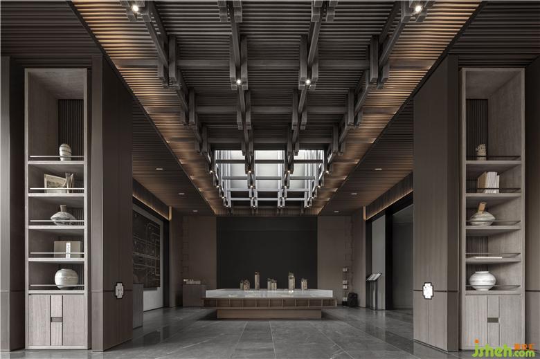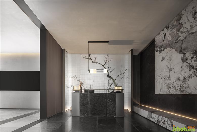 前廊設(shè)計序列的屏風,構(gòu)建空間東方“禮”的場域,形成心理儀式感的轉(zhuǎn)換中正形直的接待臺,輔以靈巧精致的金屬構(gòu)件,以精工的手法傳達細膩的工匠精神,傳達東方禮儀之美。背景題材取自古典中式畫屏,與自然水墨紋理的石材交相呼應(yīng),構(gòu)建立體的畫境空間。