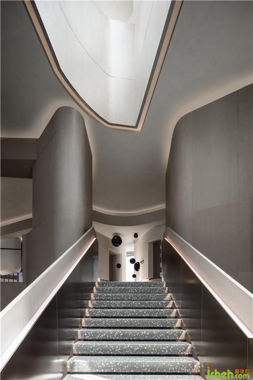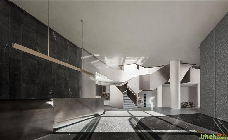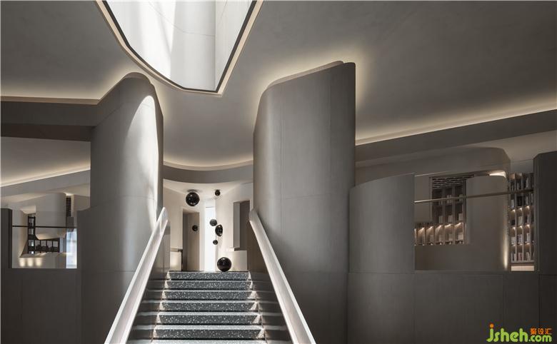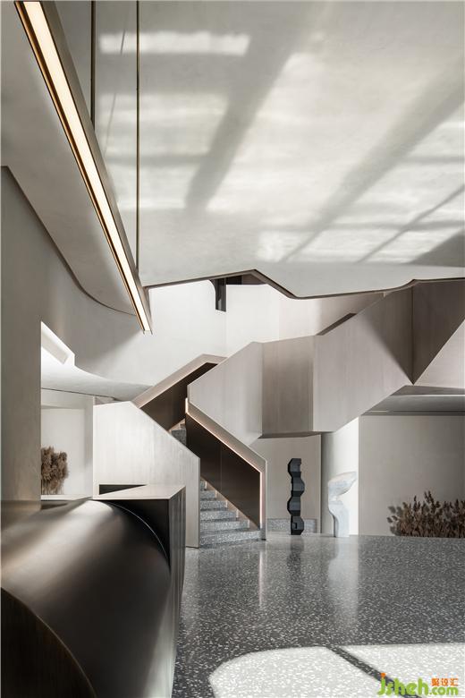 售樓處設(shè)計在平面構(gòu)成的語言上,提煉出峽谷和溪流形態(tài)為建構(gòu)載體,通過仿生學(xué)設(shè)計的抽象提純。運用西方極簡繪畫手法將“山”的語言改編,用以轉(zhuǎn)化接待臺的輪廓,當幾何形態(tài)滿載于多維空間時,便豐富了建筑的內(nèi)在層次,實現(xiàn)了室內(nèi)節(jié)奏、韻律、情感的統(tǒng)一。大自然賦予萬物的形體、累積而來的生活方式,皆為建筑帶來了不同程度的豐富,在人與自然之間,掙脫了界定,傳遞更多對于未來的想象。
