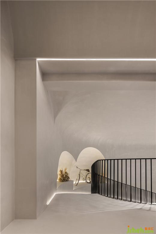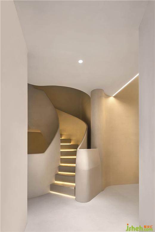 沿著坡道往下行進(jìn) 身處洞穴內(nèi)的感受 從地上層方正走到地下層橢圓形的樓梯從剛硬的線條轉(zhuǎn)換到圓潤(rùn)有機(jī)的形體同時(shí)連結(jié)側(cè)墻的內(nèi)凹造型