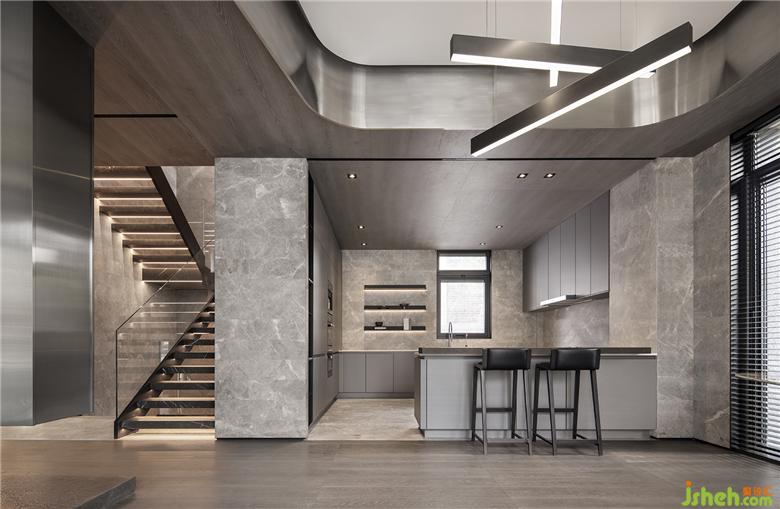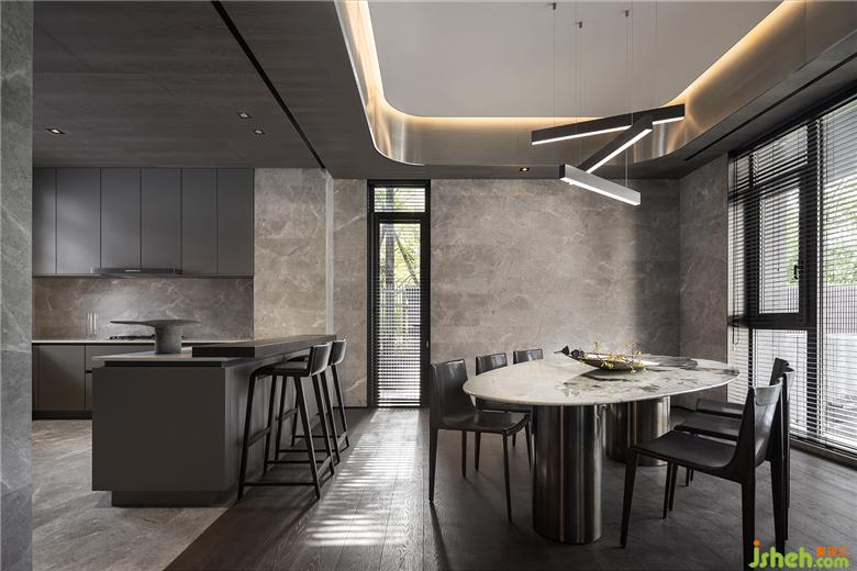 弧線板線的不銹鋼天花吊頂 結(jié)合卵石漂浮般的餐桌 形成仿佛置身藝術(shù)陳列館夢境空間