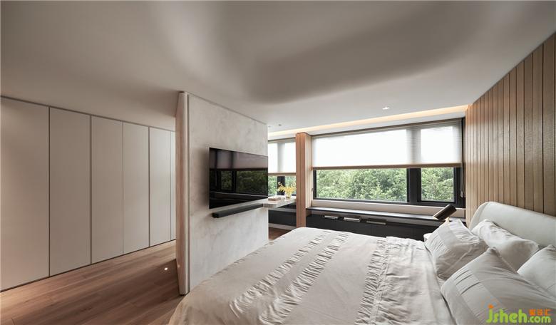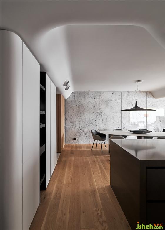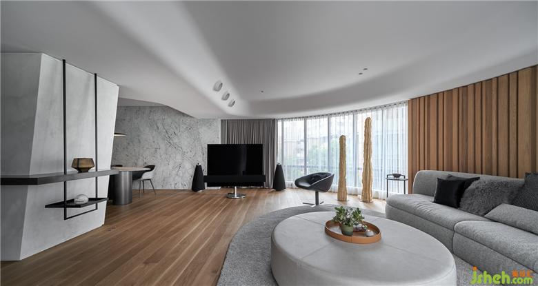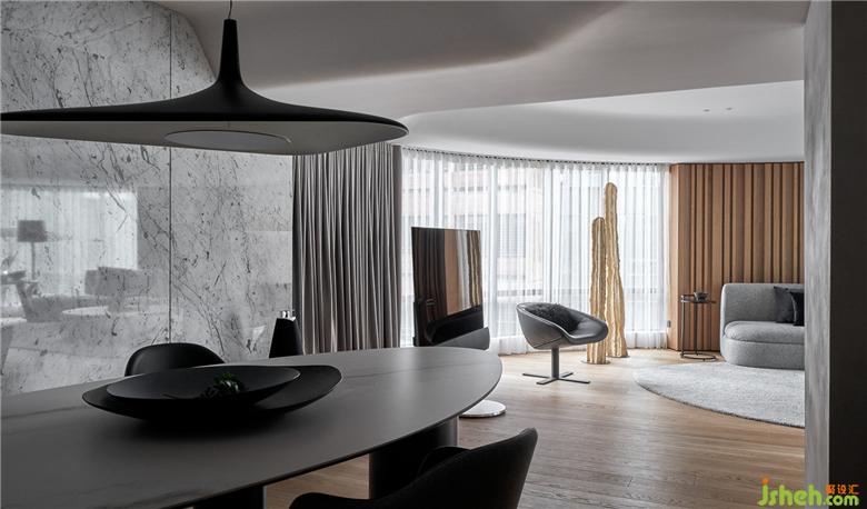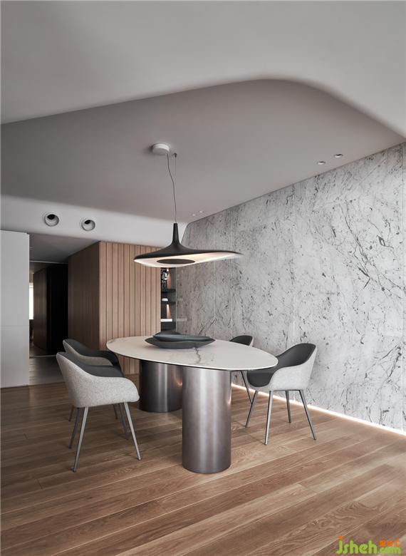 考慮到原始的建筑條件,為空間的調(diào)性做了整體的規(guī)劃,基地坐落于街道的樹海區(qū),自然環(huán)境圍繞著居住者的生活,呼應(yīng)窗外的景色打造出的休閑氛圍,家居裝修對于客廳的想象,不以主墻的形式作為空間的區(qū)隔,將落地電視安排于沙發(fā)和餐廚區(qū)之間,生活隨性,依照需求產(chǎn)生場域的聚集。材料上使用大量木皮格柵,透過木質(zhì)溫潤的特性平衡空間中的溫度,搭配白色石材作為餐廳主墻面,利用不同材質(zhì)更新了場域中主色調(diào)的變化,視覺感受的變化,影響了內(nèi)心,形成了空間中場所的轉(zhuǎn)換。
