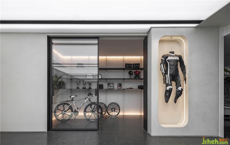 車(chē)庫(kù)以鏡面與軟膜天花為主軸 ,并在一旁的展示區(qū),懸掛賽車(chē)衣,獲獎(jiǎng)獎(jiǎng)牌,透過(guò)灰鏡與鐵件層架反射延伸,凸顯屋主藏車(chē)與收藏品的冷冽科技感(玄關(guān))從車(chē)庫(kù)進(jìn)入玄關(guān),將地坪高低差化整為一,柜體量體與地坪脫開(kāi),聯(lián)結(jié)起玄關(guān)與交誼廳的關(guān)系。