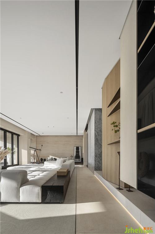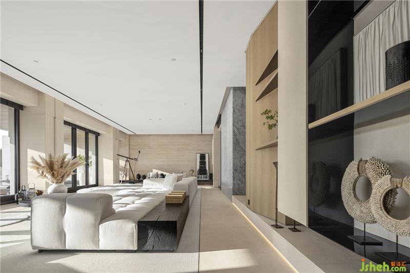 負(fù)一層社交區(qū)設(shè)定為招待賓客渡假的場(chǎng)域,運(yùn)用低調(diào)靜謐且最貼近自然的石材,依著大面積的落地窗,三亞樣板房設(shè)計(jì)灑落進(jìn)室內(nèi)的光影刻劃在石材溫潤(rùn)的肌理上, 因應(yīng)三亞潮濕的天氣,貼心的將地毯設(shè)定為固定的pvc材質(zhì)塊毯,好清理且不會(huì)發(fā)霉的材質(zhì),讓財(cái)質(zhì)化分出沙發(fā)區(qū)域,相較于石材,在肌膚的接觸塊毯更加溫暖,或坐或躺,生活面相更加多元。