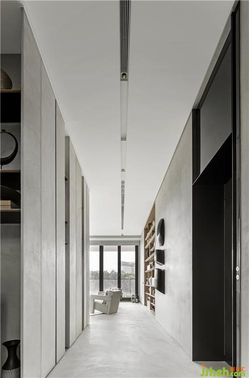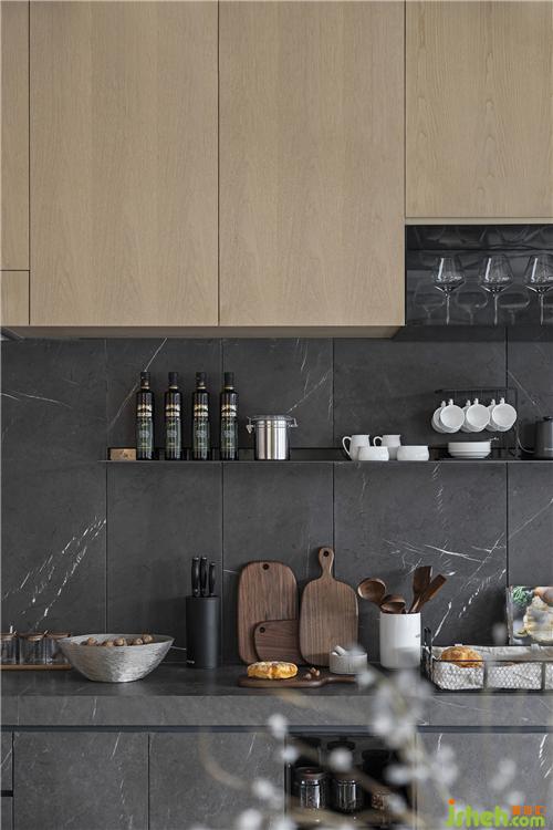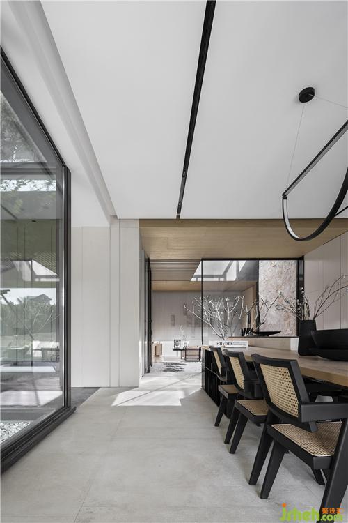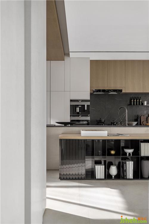 透過長廊凹凸進(jìn)退墻面的引導(dǎo),我們來到開放式的西廚區(qū)域,前后穿透的空間感,