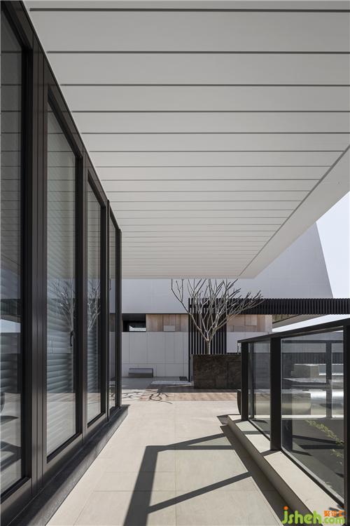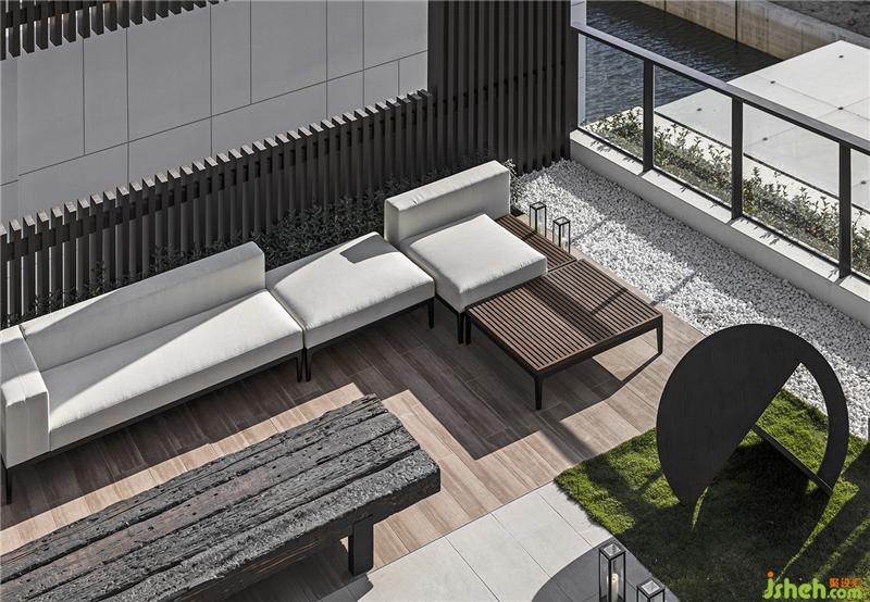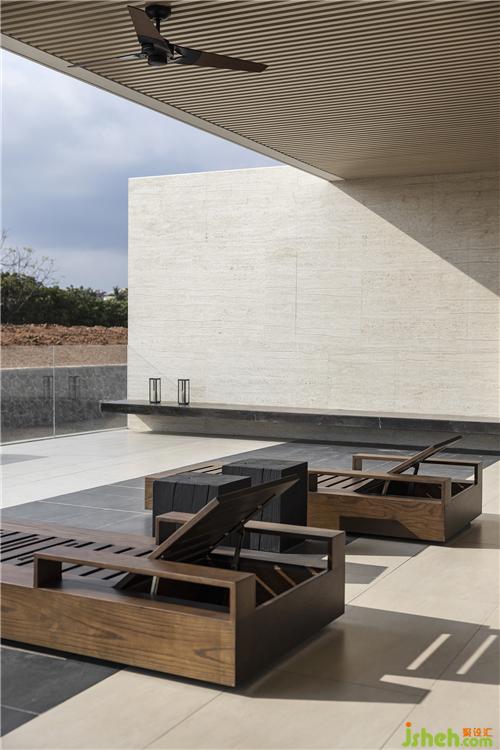 從茶室穿越到戶外泳池,賓客用餐舉辦派對的同時,可享有前后兩端不同的景觀河水潺潺流動的聲音,乘著風(fēng)穿過泳池流進(jìn)耳里,后方茶室靜謐的氛圍,光線被樹葉打散灑落在地面上,映著最深沉的石紋。
