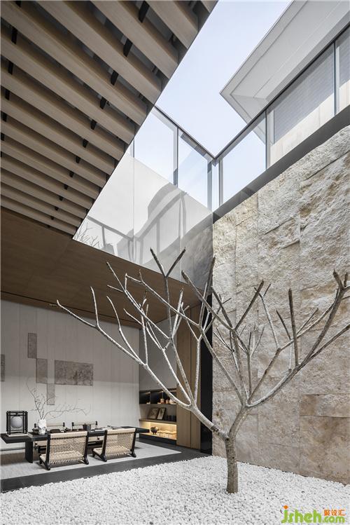 夜深了走回室內(nèi),推開景觀挑空區(qū)的玻璃門片,穿過月光映照的雞蛋花樹,坐入茶席。靜謐協(xié)調(diào)的空間石材搭配,伯爵石、米黃石皮,與深沉穩(wěn)的印度黑石材,圍塑出最平穩(wěn)的心境。品著月光,賞月、賞時間在石皮墻面流下的歲月痕跡,與自然與時間最貼近的距離,彷彿整個宇宙天地歸依在這一方空間,沉靜詩意的靈魂,只有茶香與自己。