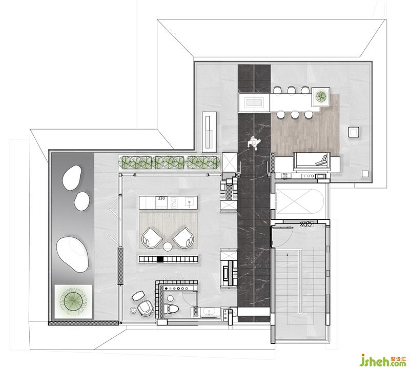 大氣的印度黑石材的地面材質(zhì)臺(tái)面上展示異形藝術(shù)品,相互造成的有趣對(duì)話,三亞樣板房設(shè)計(jì)點(diǎn)綴著全家人愉悅的相處空間。此藝術(shù)品兼具座椅休憩功能,在空間使用上帶出精致生活感,大露臺(tái)如同一個(gè)展示藝術(shù)品的美術(shù)館。