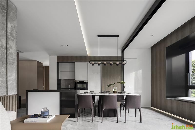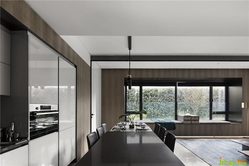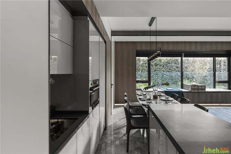 通過大氣的金屬噴黑邊框黑玻璃拉門,可開闔的廚房活動式彈性空間深圳樣板房設計,減去了厚重的墻面隔屏同時降低視覺重量。