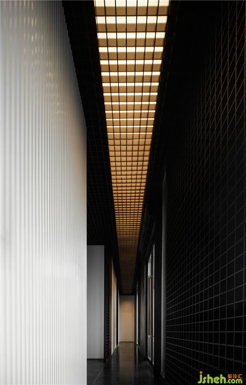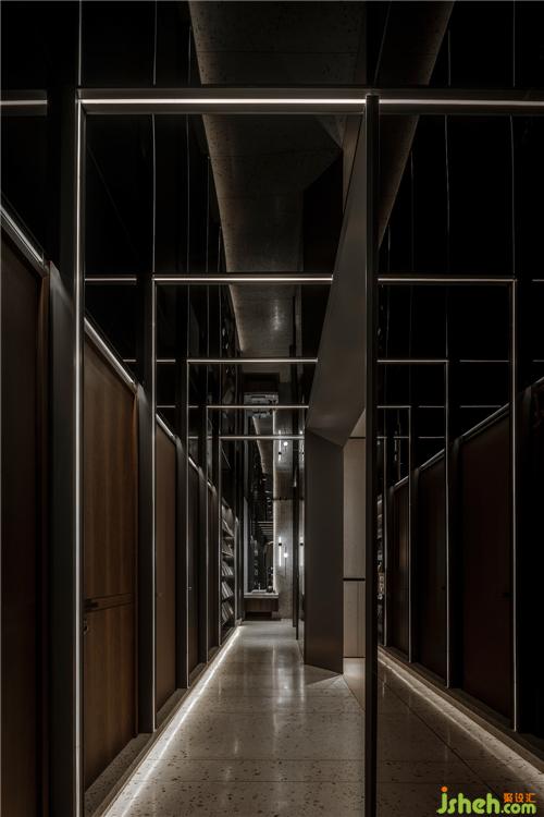 Open the door and enter the building. Part of the originally indoor space is divided to become the transition space to connect the outdoor and indoor fields, increase the layering of the space style, and create a sense of ritual of the space. It is for both mental reflection and mental experience. The space creates not only the physical changes but also the mental waves. The grid element of the same size extends throughout the corridor. The lights in the hollowed material emitting the warm light balance the function and aesthetics. The small-size grid element also increases the exquisite texture of the space. The dry timber and rough water stone wall area are arranged on the bottom as if the flowing water could be heard to create the semi-outdoor space atmosphere.