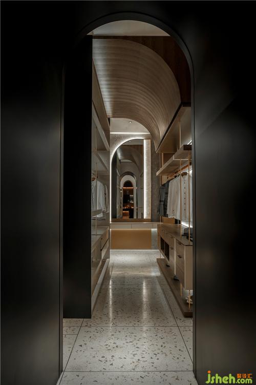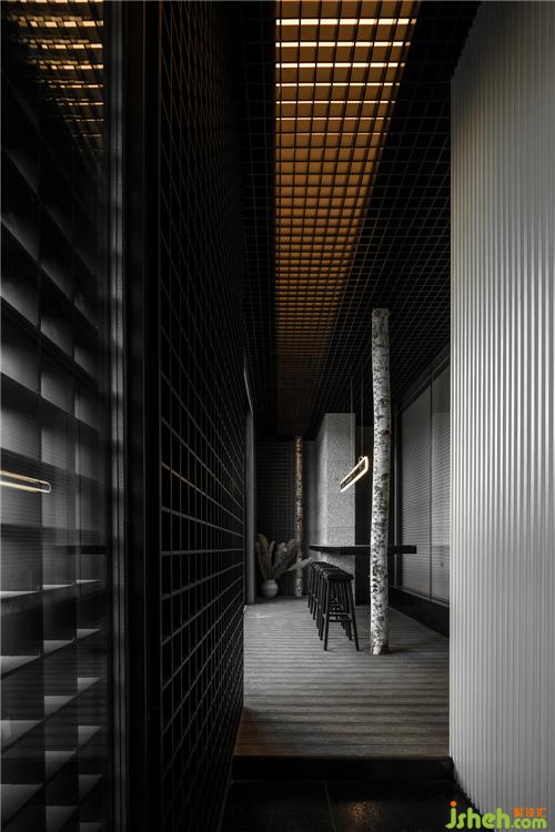 推開(kāi)大門(mén),走進(jìn)入口,將原本屬于室內(nèi)的空間,劃分一部份作為連結(jié)內(nèi)外場(chǎng)域的過(guò)度空間,增加空間型式的層次,創(chuàng)造出空間的儀式感,是心靈的沉淀,也是心靈的體驗(yàn),讓空間不只外在物理型式的起伏,更想創(chuàng)造內(nèi)在心理波瀾。利用等大的方格元素延續(xù)整個(gè)廊道空間,虛實(shí)簍空的媒材,透過(guò)燈具散發(fā)溫暖光線,平衡機(jī)能與美感,也利用這些小尺寸且等大的方格元素增加空間的細(xì)致質(zhì)感,底端輔以干燥樹(shù)木、肌理粗糙的流水石墻面,彷彿聽(tīng)到到流水聲,創(chuàng)造出半戶(hù)外的空間意境。