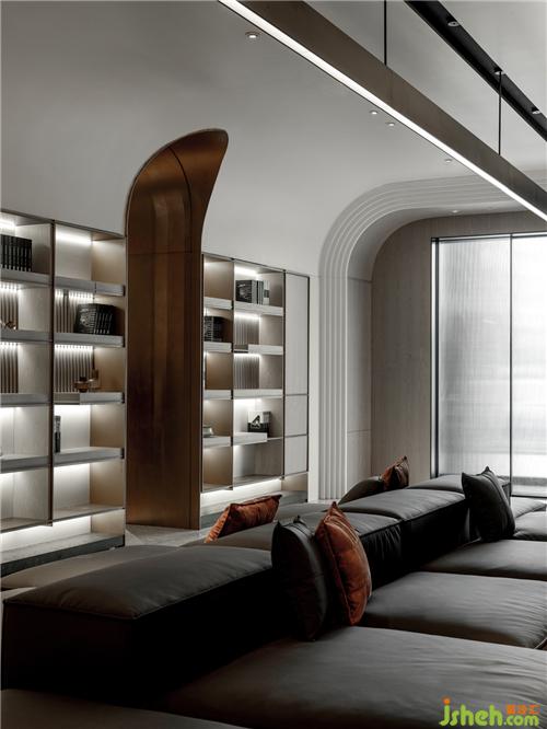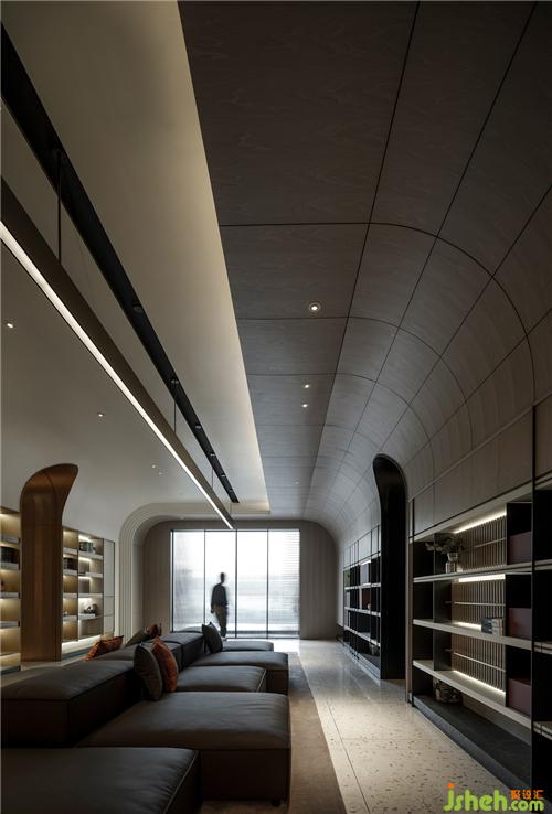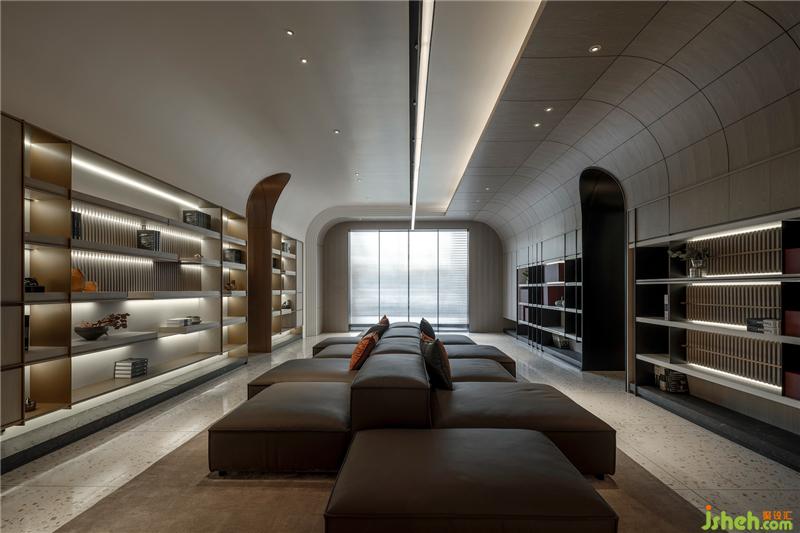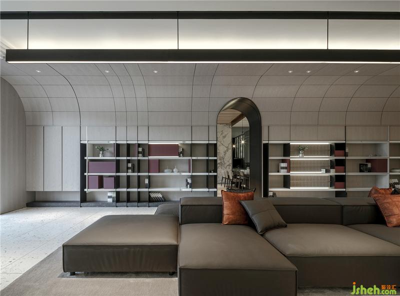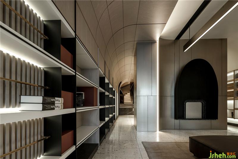 進(jìn)到展廳空間,延續(xù)建筑門(mén)頭的弧線造型,兩側(cè)弧型天花板,由前往后延伸,象是翻書(shū)后翹起的空間語(yǔ)匯,也用不同高度創(chuàng)造出空間高聳的層次,劃分空間領(lǐng)域的同時(shí),保留視覺(jué)穿透感,展現(xiàn)高端訂制的高級(jí)感,也劃分空間。天花板線條往下延伸至柜體也和天花板一樣往后延伸到底端,讓柜體產(chǎn)品可以獨(dú)立存在,也可以與空間天花板造型相互連結(jié),柜體分割利用不同尺寸的皮革塊體,讓空間增加趣味層次,皮革的紋路,軟化空間的造型線條,木皮紋路與烤漆干凈的表面形成對(duì)比,兩個(gè)材料的相互穿插搭配,沈陽(yáng)展廳設(shè)計(jì)創(chuàng)造出空間的律動(dòng),用大面積的淺色材質(zhì)襯托,增加視覺(jué)焦點(diǎn),柜體金屬立板與木皮層板的厚度相互對(duì)應(yīng),增加柜體產(chǎn)品的細(xì)節(jié)與層次,創(chuàng)造細(xì)節(jié)時(shí)也增加產(chǎn)品的質(zhì)感。有別于一般展廳一進(jìn)到空間為接待柜臺(tái),在這里一進(jìn)到空間為一座沙發(fā),就象是客廳一般,底端壁面的壁爐造型,營(yíng)造出家中客廳團(tuán)聚溫潤(rùn)的意境。