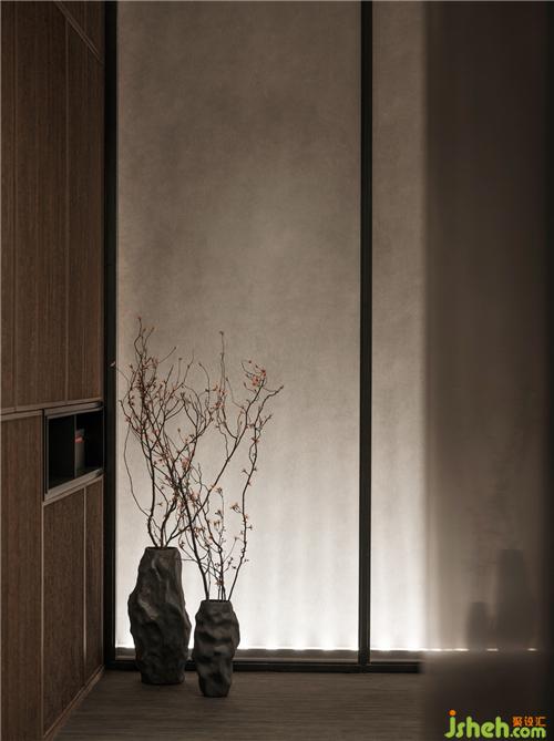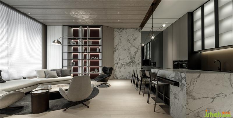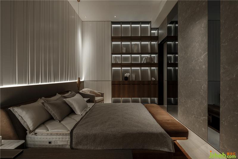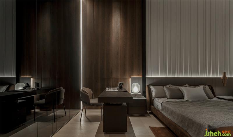 更衣間弧型交錯的造型天花板延續(xù)整體空間的造型元素,開放的柜體讓狹長走到得以釋放空間,鐵件吊件的造型,展現(xiàn)柜體的輕盈感,減少更衣間的壓迫,皮革的背板增加柜體的質(zhì)感。臥室白色烤漆墻面,墻面線條的分割增加空間的表情,床頭深色皮革背板搭配一旁木皮的溫潤,像個女孩般,有非凡的氣質(zhì),高冷的儀態(tài),優(yōu)雅的姿勢,炙熱的內(nèi)心
