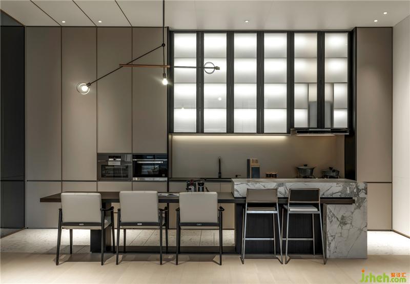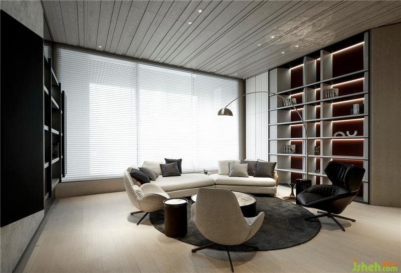 進(jìn)到展廳第一個空間,赭紅色的皮革強化整體視覺焦點,白色石材與淺色木皮襯托出空間的優(yōu)雅氣質(zhì),也讓空間更凸顯的紅潤,香檳金屬的面材,隱約帶出空間的低調(diào)奢華,圓弧沙發(fā)帶出空間的恣意盎然,沙發(fā)后方柜體斜板造型,創(chuàng)造出柜體的律動感,也增加空間中不同面向的造型語匯。