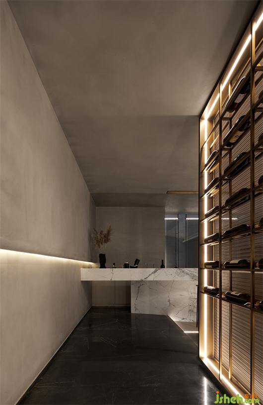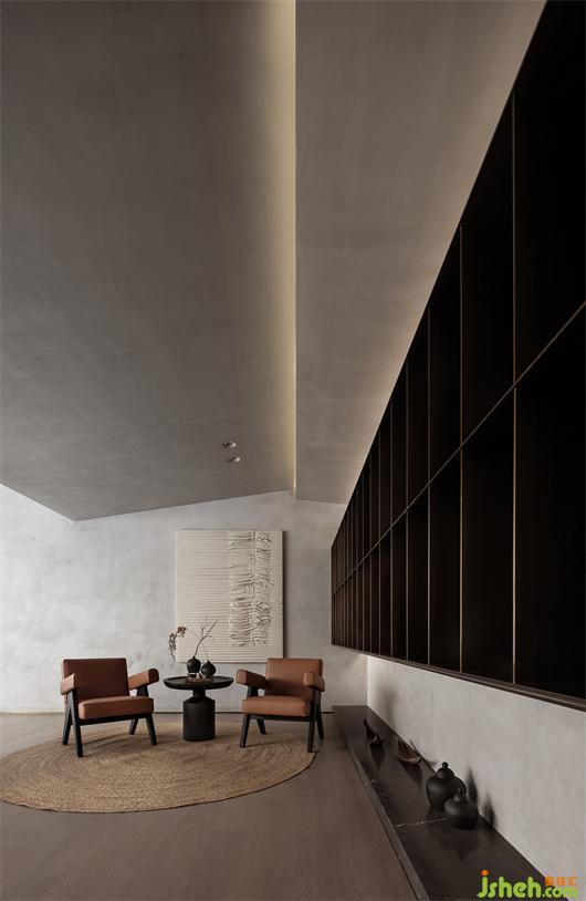入口玄關(guān)處木皮與微水泥形成材質(zhì)交疊對(duì)比,創(chuàng)造重點(diǎn)空間轉(zhuǎn)換的心理感受。