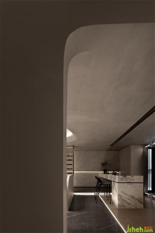 光線可以賦予空間無(wú)限想象,采光讓陽(yáng)光肆意地在室內(nèi)自由跳躍。開(kāi)放的客餐廳格局中,藝術(shù)格調(diào)的微水泥鋪展開(kāi)來(lái),不同灰色的明度關(guān)系與冷暖關(guān)系被精心安排。