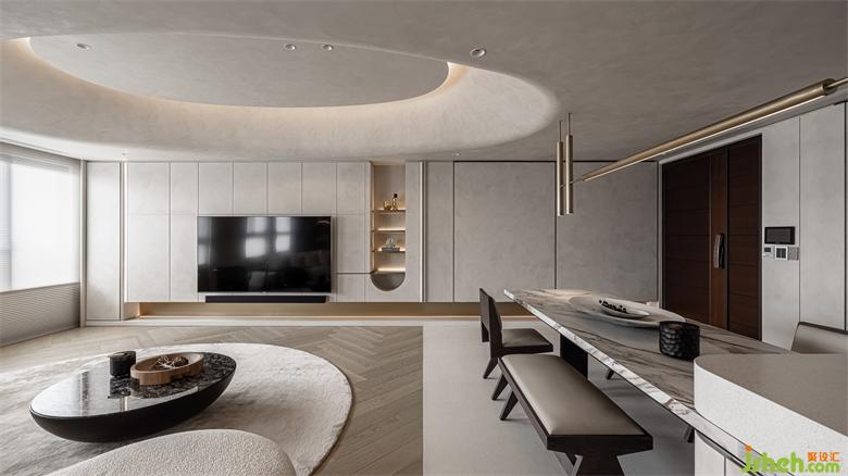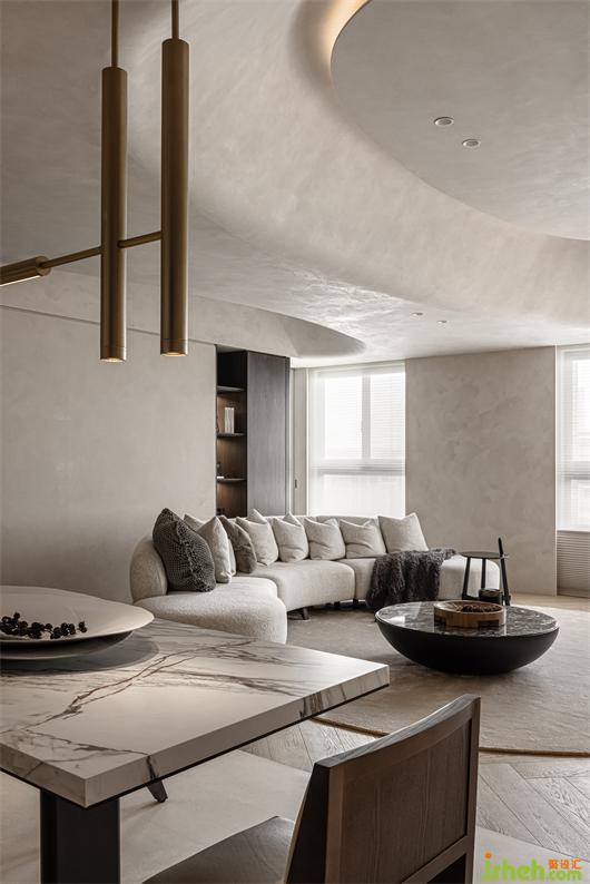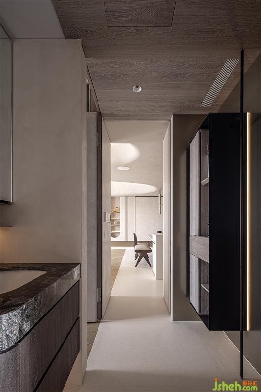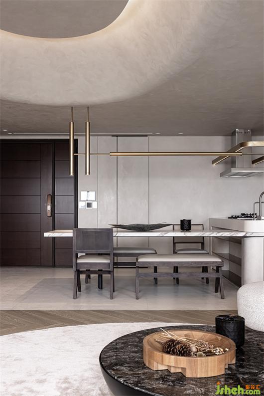 中性的空間背景,自然質感的木質元素,結合空間中柔軟的織物與局部石材、金屬的點綴,讓空間呈現(xiàn)更干凈時尚且?guī)в袦剀盎{