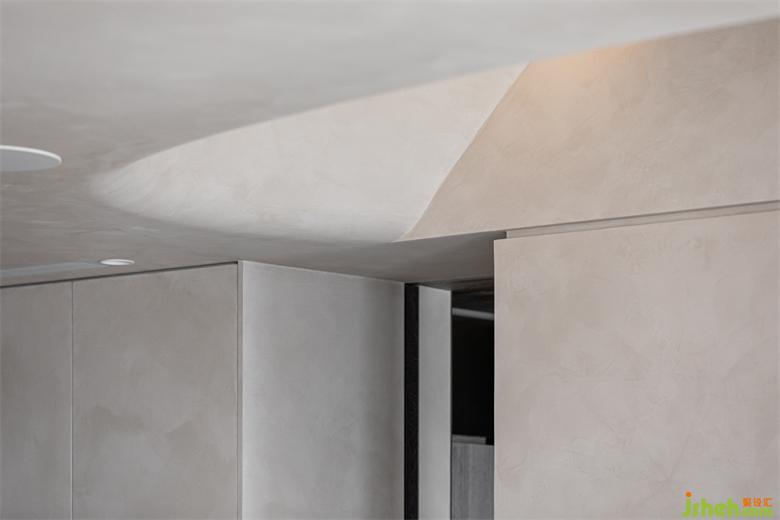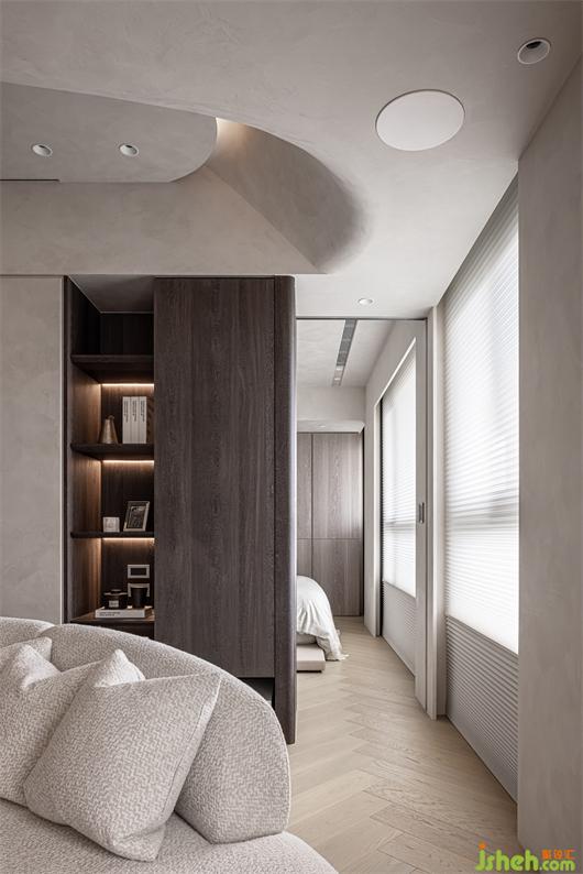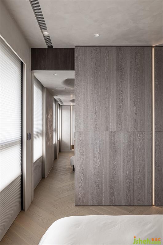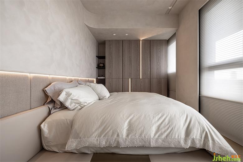 豪宅設計房間沿用微水泥與木地板的搭配,整體樸實的色調,加入柜體崁燈和弧線的平衡,床頭以皮革與壁布搭配,將空間的尺度最大的保留給生活空間,床頭內崁燈將空間氛圍呈現(xiàn)更為溫柔的氣息。