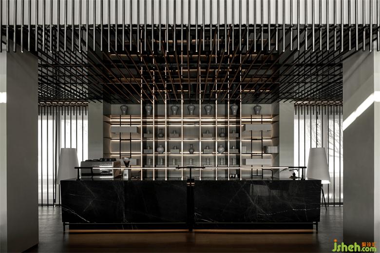 仿銅金屬圓管陣列有序、水墨痕的灰色理石氣勢沈穩(wěn),淺咖色實木有節(jié)奏的縱橫交錯……編織出紋理豐富的水吧區(qū)立面,而立面則是壹個連綿不斷的平面,多重材質(zhì)之間的轉(zhuǎn)換交替通過不同肌理一致的方向性達(dá)成統(tǒng)一,接待、陳列等輔助功能區(qū)域則在這些立面之后鋪陳展開。用豐富的透明性表達(dá)空間關(guān)系也延續(xù)到了這些不同的立面——借助橫豎交錯的燈光,建筑外部的竹林景觀成爲(wèi)室內(nèi)中央核心區(qū)的背景圖,而功能性立面則透露出更隱約、含蓄的朦朧之美。