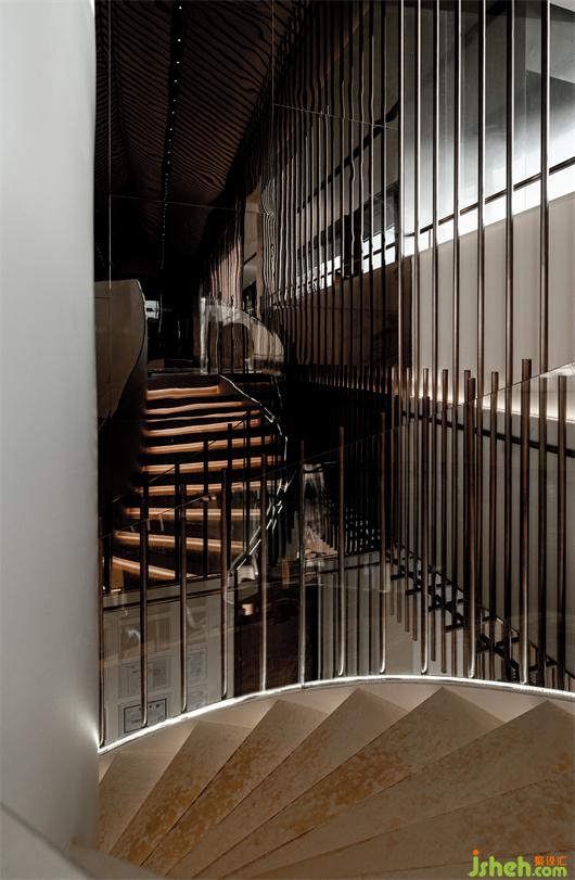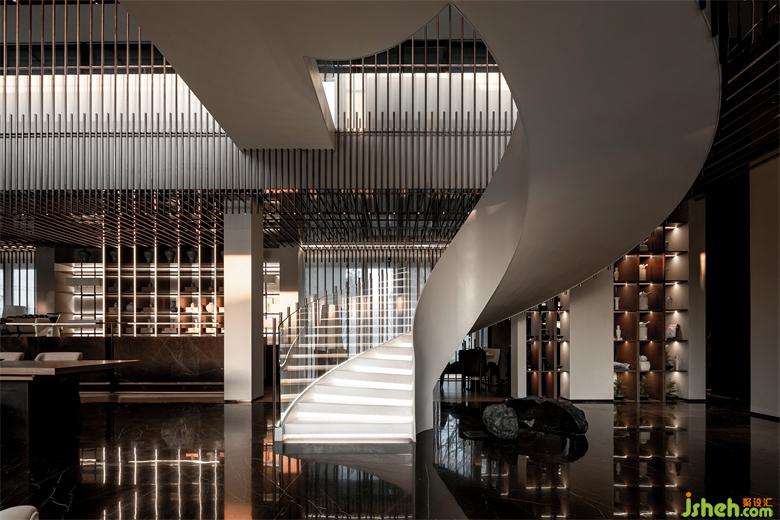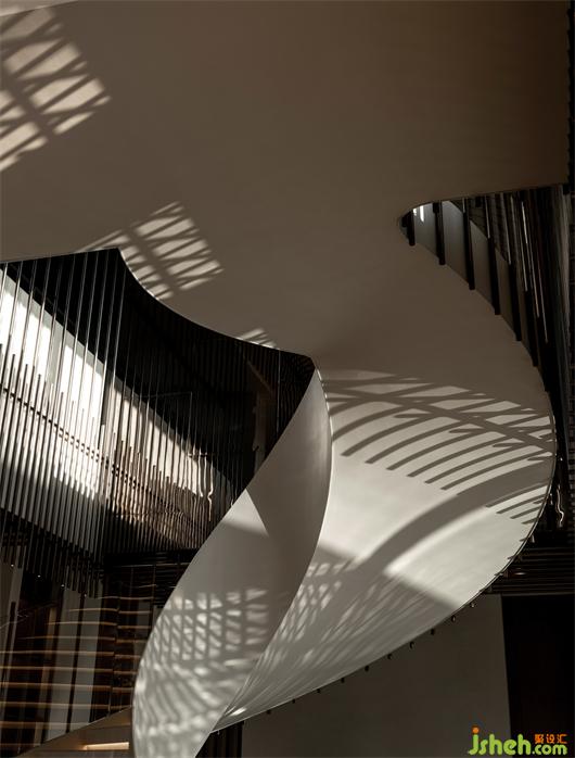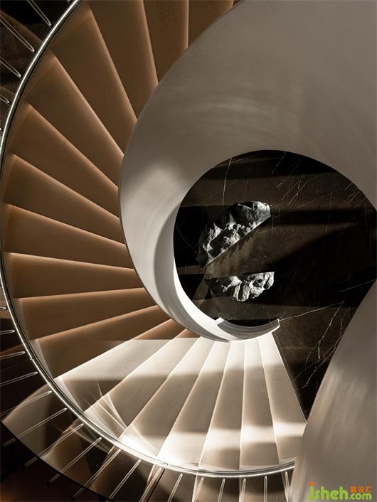 站在空間中心處,以洽談長桌爲(wèi)中軸、藝術(shù)樓梯爲(wèi)核心??梢韵騼蓚€分支張望,讓游者自然的就順著光和景觀,愉悅地徜徉其中。
