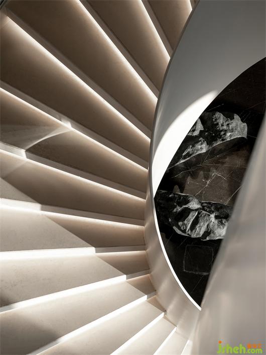 連接二層VIP室的樓梯是壹個小小的轉(zhuǎn)場,從鸚鵡螺獲取靈感來源,黃金比例的結(jié)構(gòu)分割。會所設(shè)計更像從天而降的大型藝術(shù)裝置,轉(zhuǎn)軸式的視線吸引,瞬間將前廳的克制推遠。淡泊甯靜的暖灰色調(diào),是壹個再進入的起點。與尖銳的大塊面金屬天花、陣列格柵,在強烈線條感的空間對峙中找尋平衡,實現(xiàn)空間情緒的深沈進入。