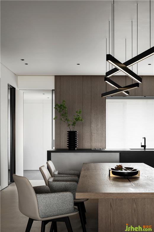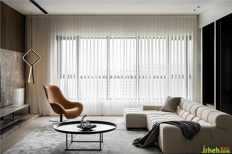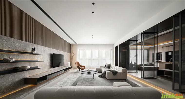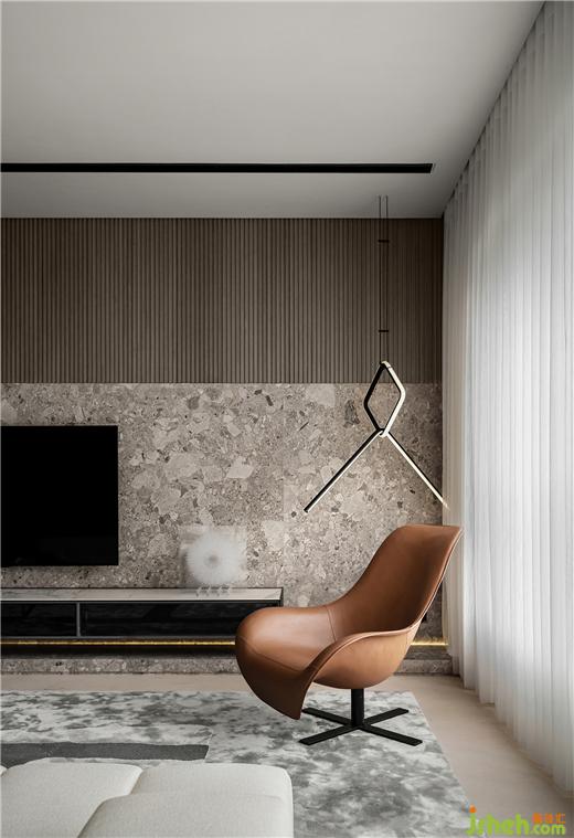 客廳背景墻采用木格柵和大理石拼接碰撞,