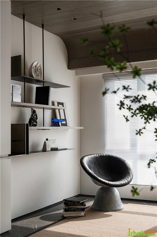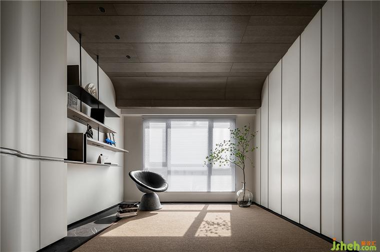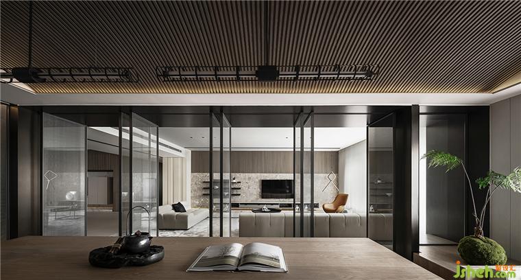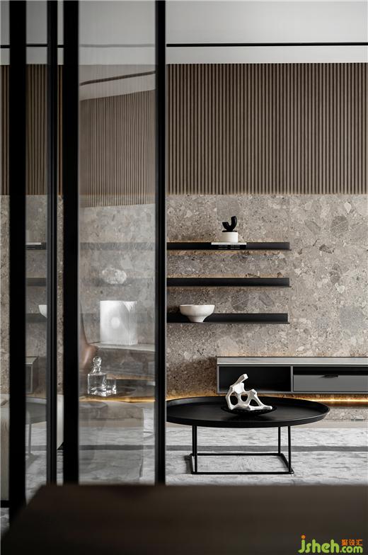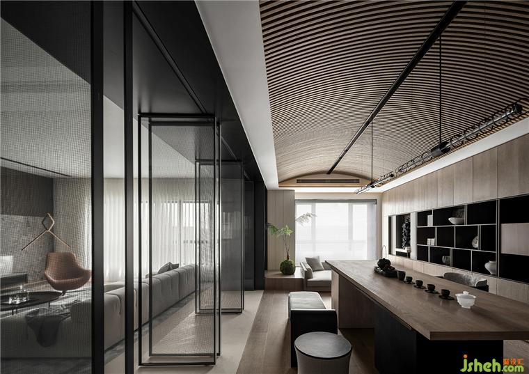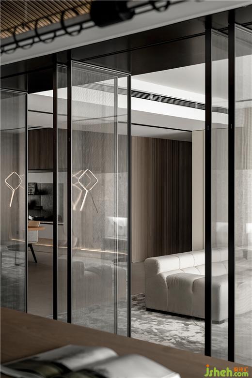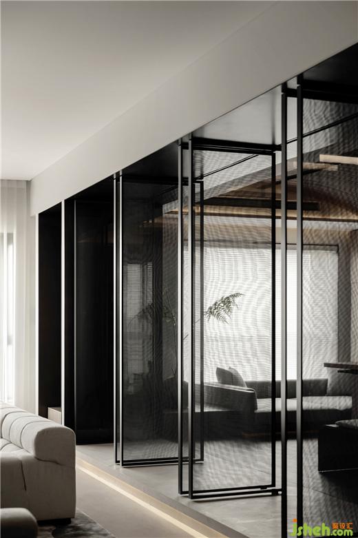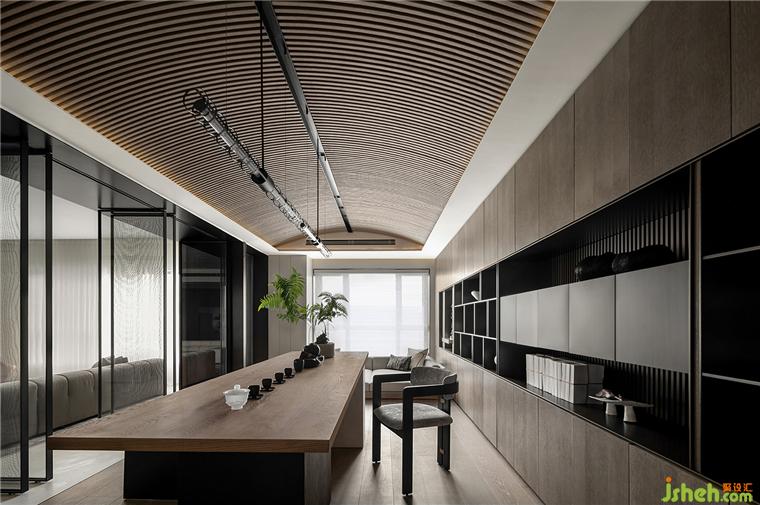茶室.會(huì)客區(qū)整體抬高處理,天地軸玻璃門分空間區(qū)域,形成主人靜謐獨(dú)立的空間。