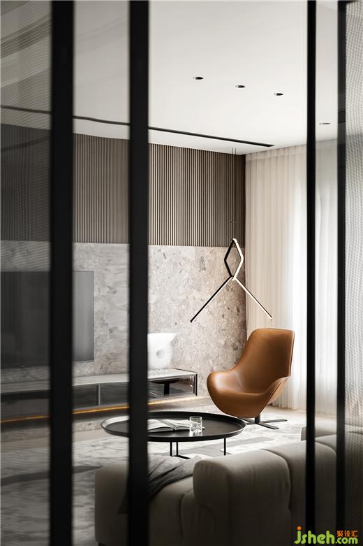臨沂豪宅設(shè)計(jì)大面積原木家具連接頂部弧形木格柵吊頂、地面木地板,用相同調(diào)性的材質(zhì)打造空間溫度。