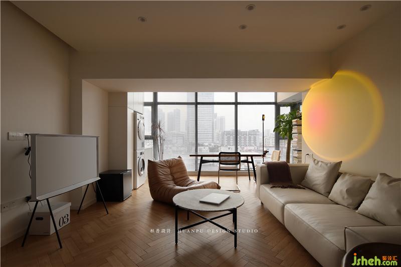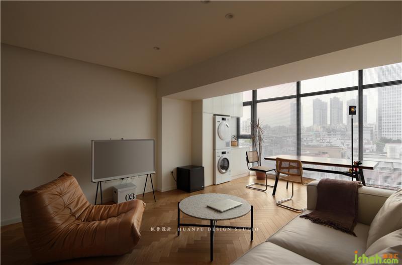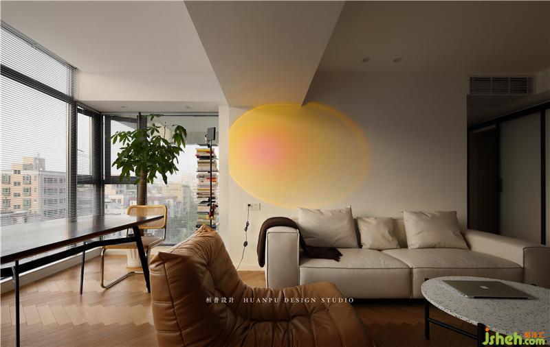 客廳部分四面白墻,搭配人字拼木地板,色調(diào)干凈溫暖。整面的落地玻璃讓視覺上更加的開闊,搭配原始的百葉簾,無論是日光還是晚霞,映照進室內(nèi)的光影都是絕美的。