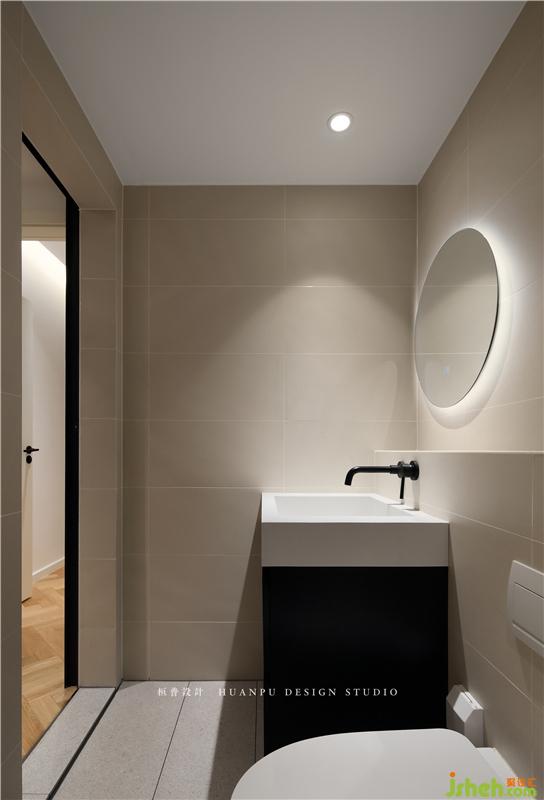 衛(wèi)生間的采用了米白色的墻磚與素色的水磨石地磚進(jìn)行搭配。整體色調(diào)統(tǒng)一,干凈舒適。300*600的墻磚尺寸讓視覺上更加的大方美觀。