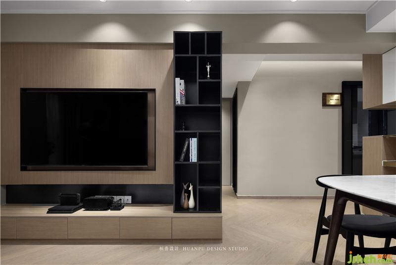 電視墻采用色調(diào)統(tǒng)一的茶色木材,大氣不沉悶,黑色展示柜立于電視墻旁,與此形成視覺(jué)反差帶來(lái)別樣觀感體驗(yàn)。