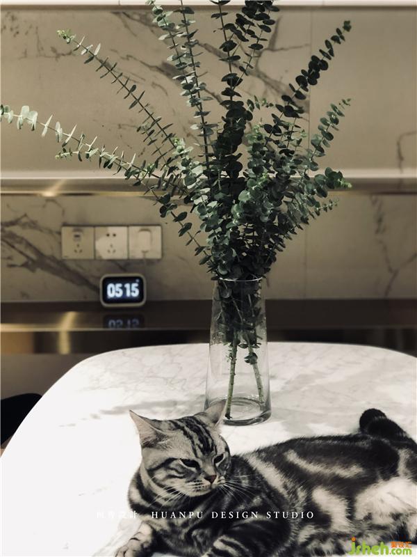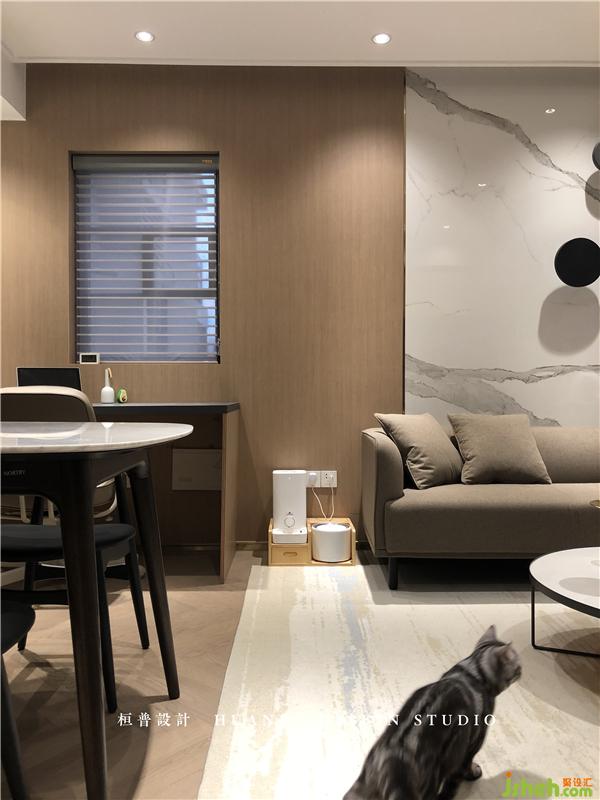 沙發(fā)與客廳辦公區(qū)中間預(yù)留了貓咪私人物品的空間,讓家里的每位成員都有屬于自己那片小星光。