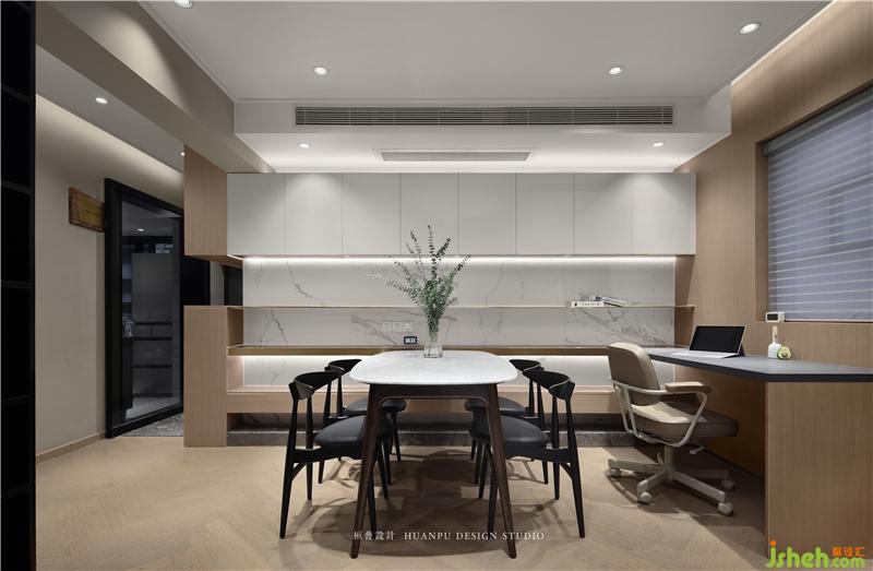 利用立面空間進(jìn)行收納,有限空間里創(chuàng)造最大收納功能同時(shí),放大視覺(jué)效果。延伸出來(lái)的辦公桌則是充分利用了多余的空間。在合理利用空間功能分區(qū)的同時(shí)也兼并了視覺(jué)上的美觀。