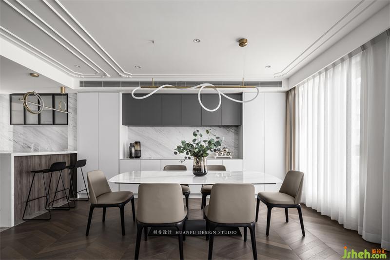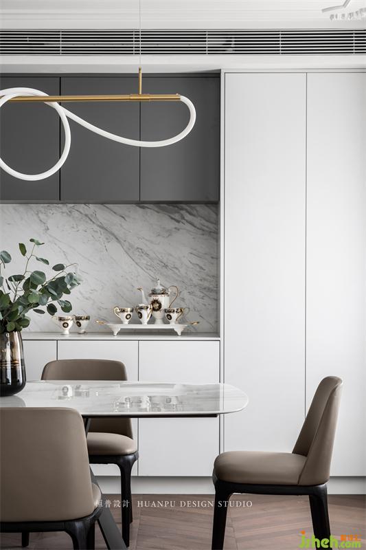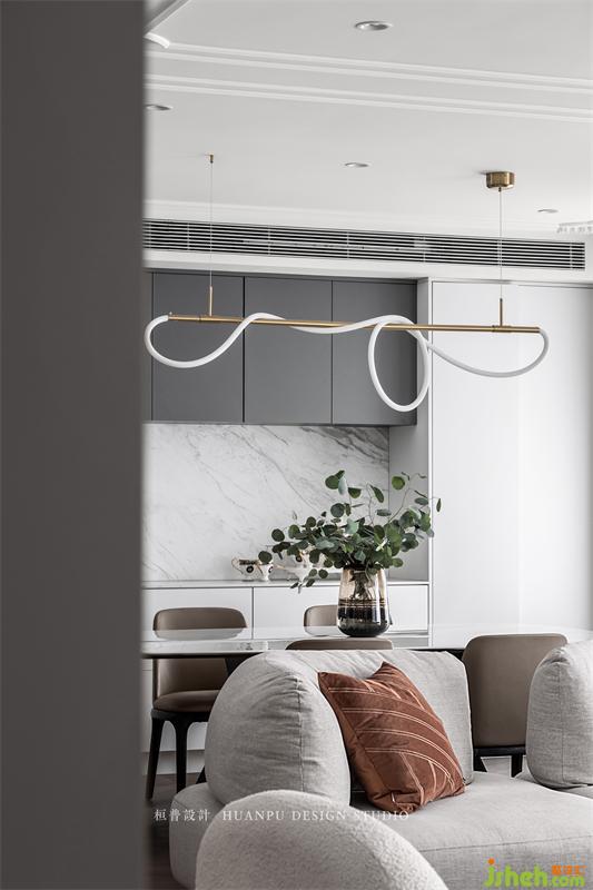 我想和你一日兩人三餐四季,創(chuàng)意個(gè)性長(zhǎng)條吊燈完成了一個(gè)和諧溫馨的畫面。上下置物柜的顏色選擇了灰白配色,與空間中的黑色元素相呼應(yīng),使得空間更有層次感。