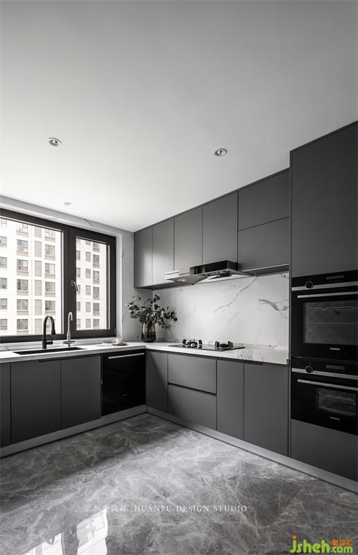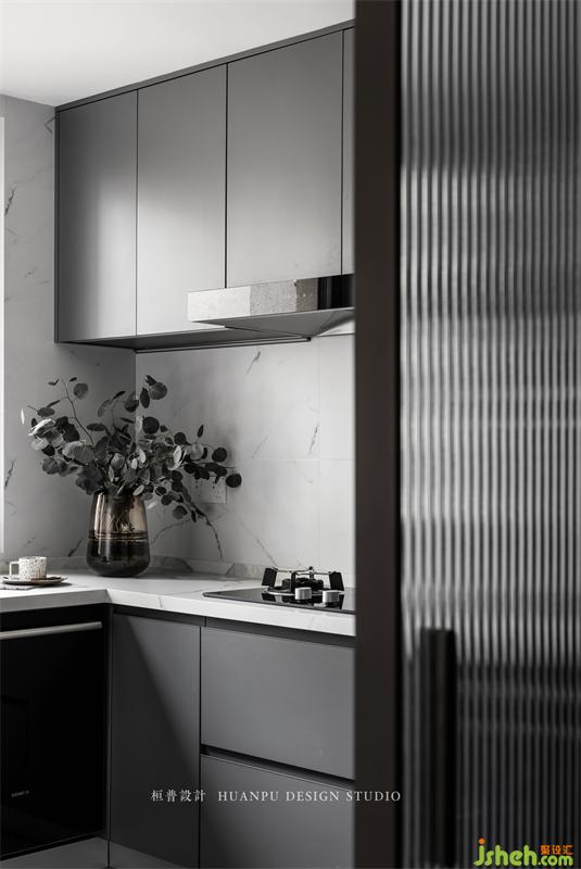 廚房主要使用深灰色功能性高柜,提升儲(chǔ)存空間。地板和墻面都采用瓷磚,方便清潔。為滿足烹飪需求,放置了蒸烤箱和凈水器,隨心所欲制作屬于兩個(gè)人的一日三餐。