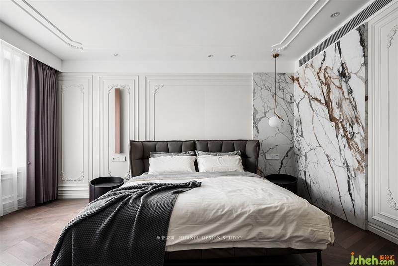 主臥的設(shè)計感會相對強一些,護墻板跟巖板進行拼接,給整個空間增添幾分藝術(shù)感。球形床頭吊燈營造了一種浪漫氛圍,而墻體上的條狀壁燈與吊燈有一種平行呼應的感覺,使得整體在視覺上更加舒適。