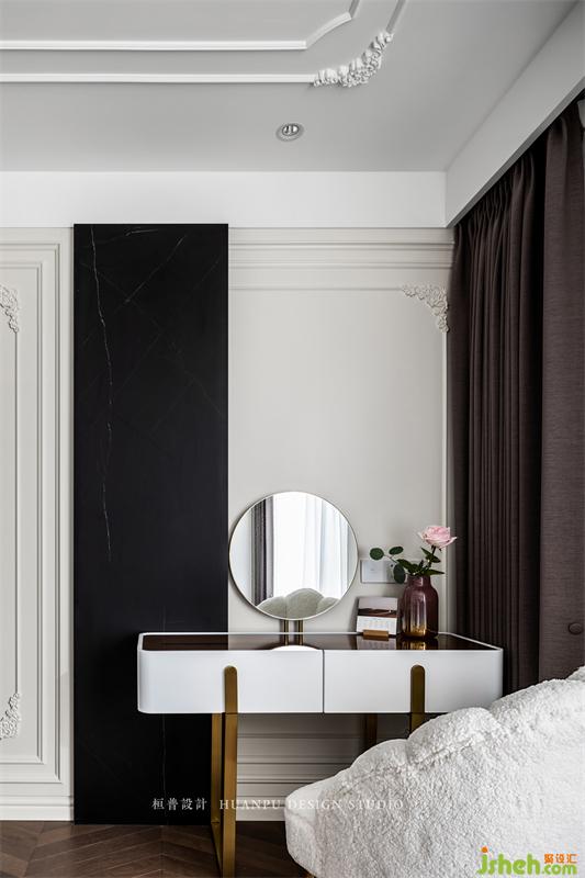 梳妝臺這里特地拼接了一塊深色巖板,又增加墻面的質(zhì)感層次,凸顯設(shè)計感。