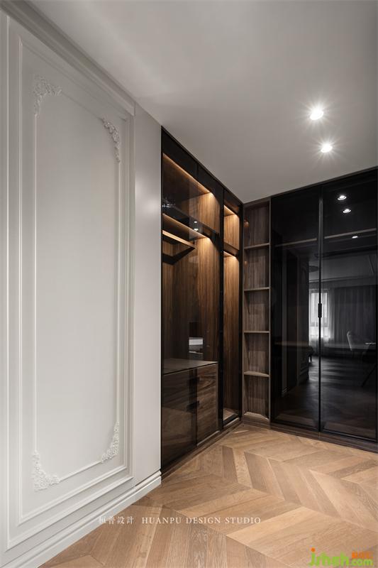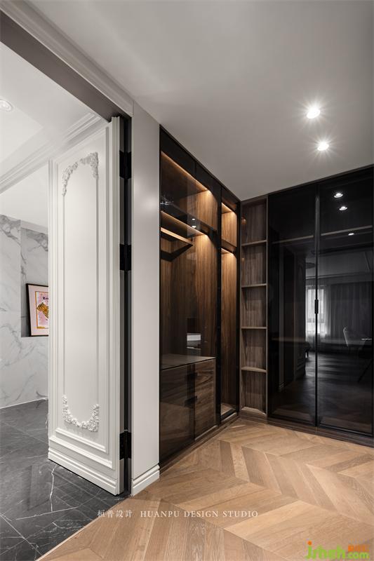 主衛(wèi)的門采用了隱形門設(shè)計,關(guān)上之后保持了衣帽間的整體美觀度。玻璃衣柜門與木紋衣柜相得益彰,起到了展示與收納的作用。