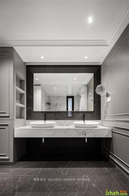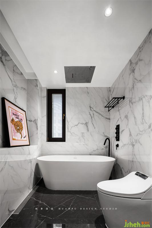 盥洗盆左手邊是一個柜子,但外面做成了壁龕,方便放置日常使用頻率高的洗浴用品等。主衛(wèi)地板用的是仿大理石瓷磚,經(jīng)過密縫處理,看起來更加美觀。