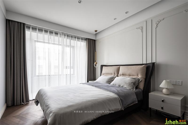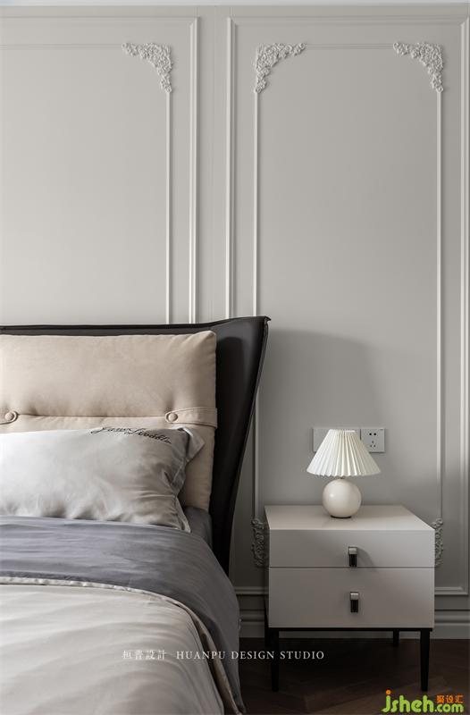 由于父母只是偶爾過來居住,所以選擇在父母房旁的增設(shè)空間作為陽臺使用。父母房沒有額外在墻體上做材質(zhì)碰撞,跟全屋整體一樣使用護墻板。雖然是白墻,但法式線條雕花讓整個空間看起來更加簡約大方。白色床頭柜與小臺燈很好的與房間整體風格融合,沉穩(wěn)簡約。