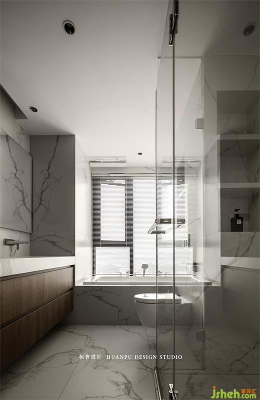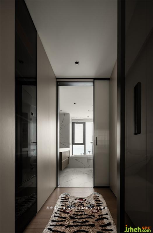 步入式衣帽間,直通衛(wèi)生間,流線簡(jiǎn)單,中間用玻璃隱藏門作為隔斷,更好的區(qū)分功能區(qū)域。