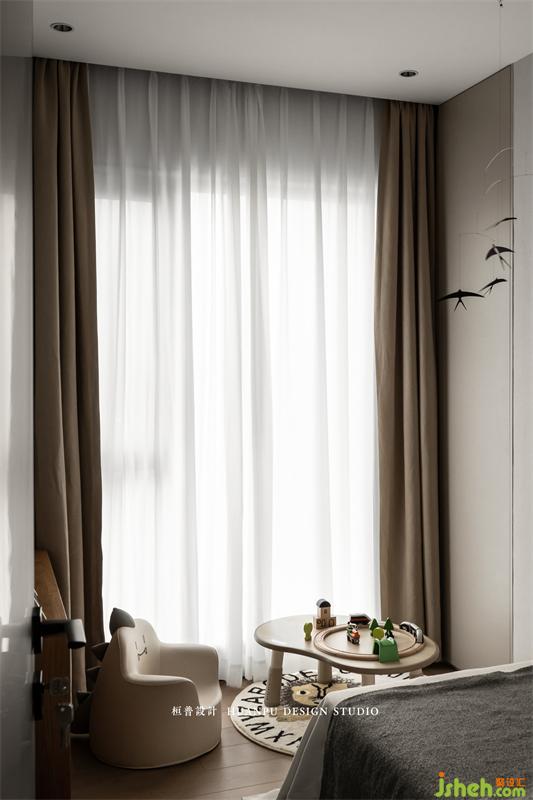 兒童房沒有做太多的固定家具,內(nèi)嵌一組衣柜,其余都采用活動(dòng)家具,