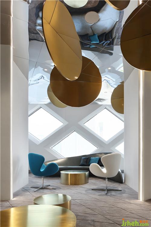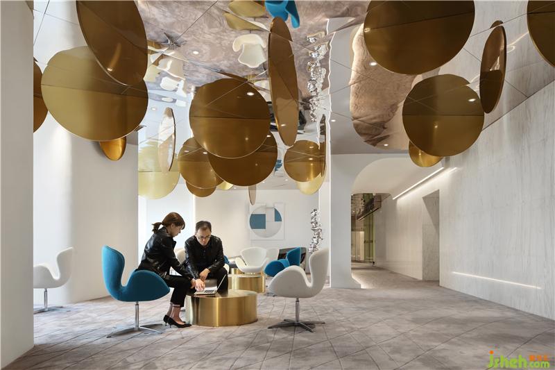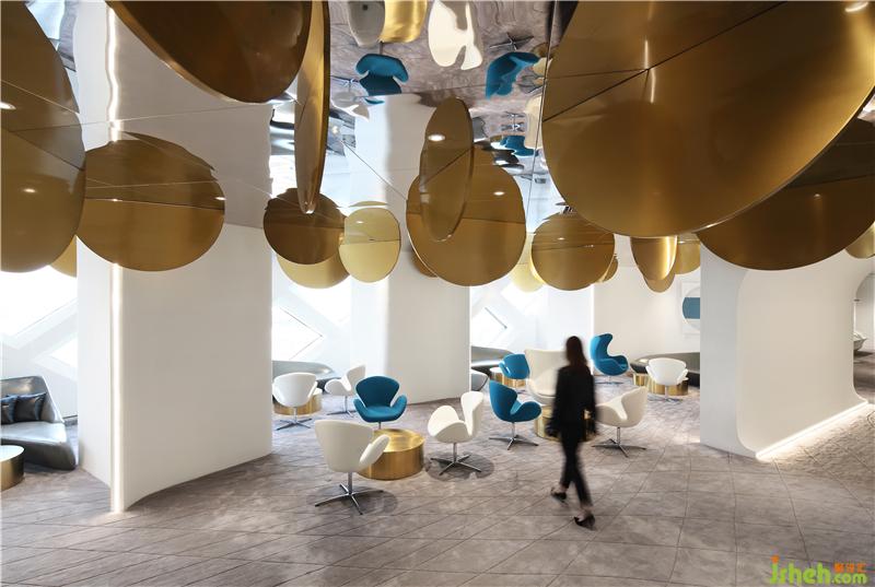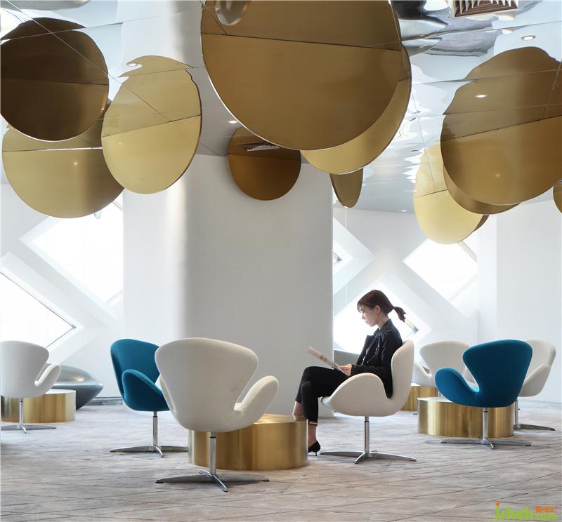The inner place follows the spatial logic of the reception area and continues to use stainless steel mirrored ceilings. The image of "circle" is still the measurement scale of space. The semicircle art installation embedded in the stainless steel ceiling is transformed into a whole circle of different sizes and directions through the projection, creating a light floating feeling.