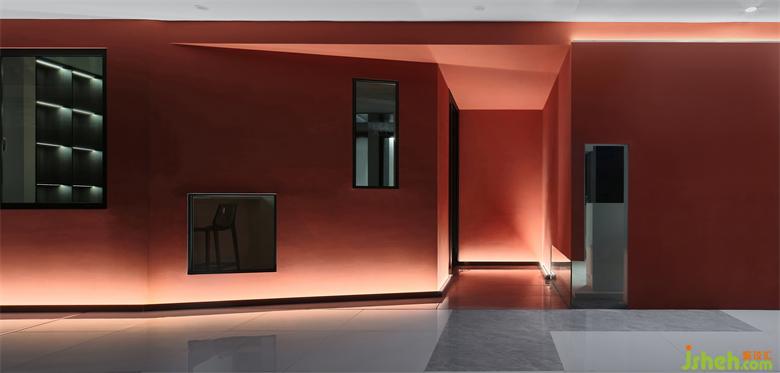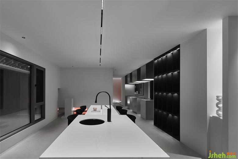 巨幅窗景,巨大的開放式島臺,作為靈活性最強的空間,承擔(dān)著聚會、活動等多重功能,為每一種可能提供恰切相宜的舞臺。系統(tǒng)門窗展廳設(shè)計凹槽,切角,不規(guī)則的穿插裝置,實現(xiàn)了空間層次、景別的遞進式韻律,一種關(guān)注精神性、注重流動感的設(shè)計語匯在此形成。