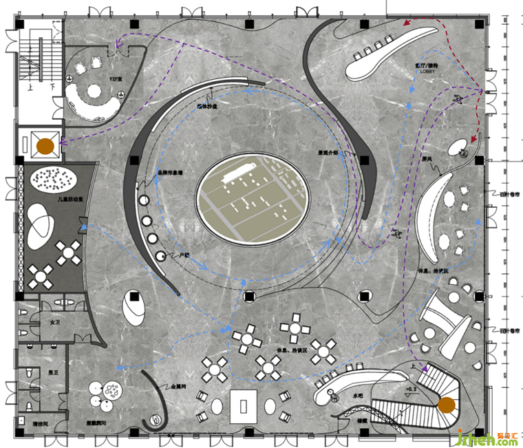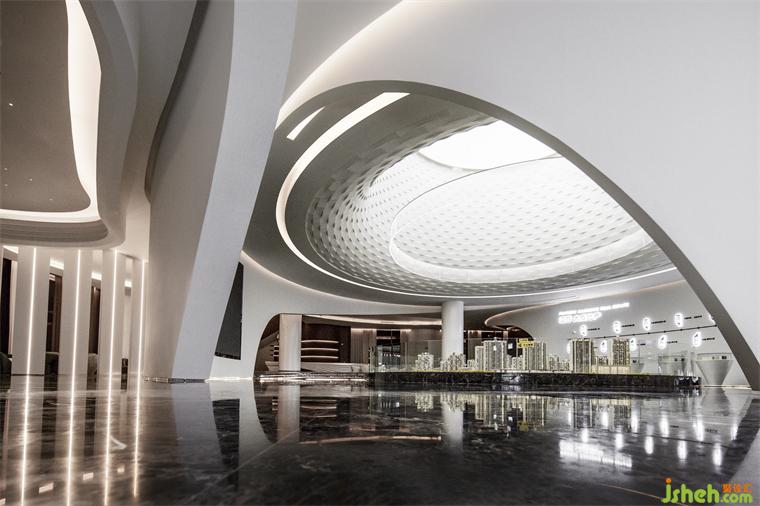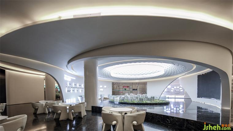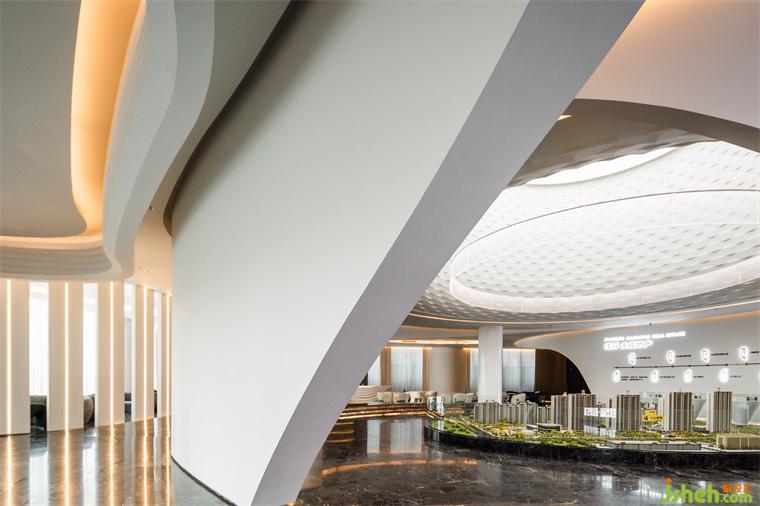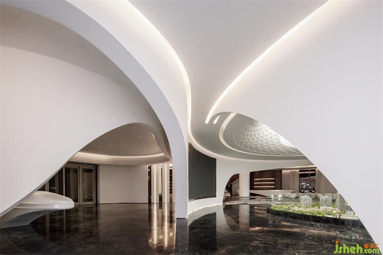 在規(guī)則的1200㎡內(nèi)部,無(wú)論是生活家園還是精神圖景,售樓處設(shè)計(jì)都放棄了直角、堅(jiān)硬與頑固,轉(zhuǎn)而追尋自由的弧與流線,那是在河流、波浪頂端、云的邊緣、人的臉龐上的曲線,曲線構(gòu)成了該項(xiàng)目設(shè)計(jì)想象中的全部宇宙,一個(gè)彎曲的、愛因斯坦式的宇宙。