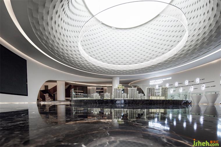 售樓處設(shè)計(jì)師利用結(jié)構(gòu)柱和兩層嵌套的柔軟曲面撐起一個(gè)巨大的向下垂蔓的核心結(jié)構(gòu),頂部與立面相連,以此作為整個(gè)空間的流線核心和視覺主體。結(jié)構(gòu)柱與穹頂和地面的接觸點(diǎn)撐起中央更開放的空間并形成更大的跨距,這是傳統(tǒng)拱形結(jié)構(gòu)無(wú)法實(shí)現(xiàn)的。它像一座只有屋頂和地面的房子,立于堅(jiān)實(shí)的黑色土地之上。