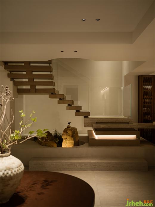 負(fù)二層樓梯形構(gòu)與酒吧結(jié)合如空間靜態(tài)雕塑。